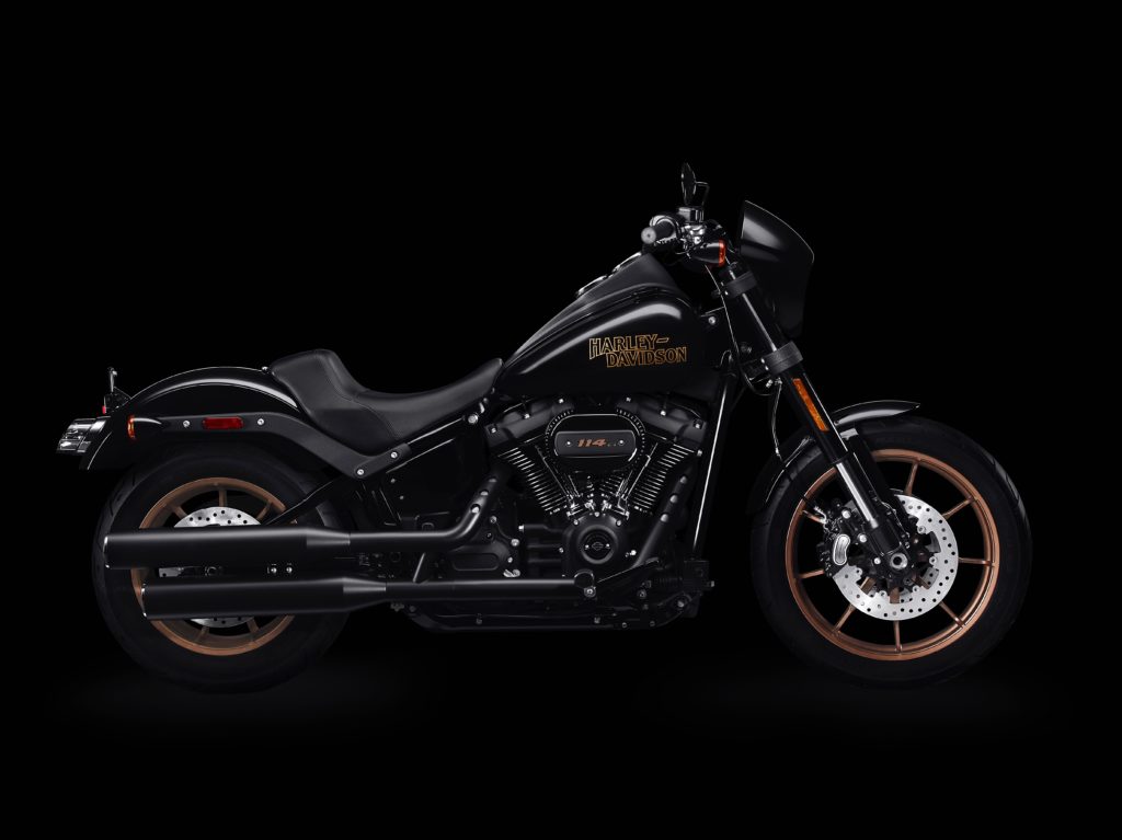 The 2020 Low Rider S, shown here in vivid black, has a base price of $17,999. Black is certainly the theme—the powertrain, primary cover, and tank console are finished in Wrinkle Black; the derby cover, intake, and lower rocker covers are Gloss Black. Mufflers and exhaust shields are Jet Black. Forks, triple-clamp, riser and handlebar, and rear fender supports are Matte Black. Photo courtesy of Harley-Davidson.