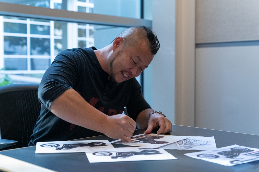 Harley-Davidson lead designer Dice Nagao reviews his sketches of the 2020 Low Rider S. Photo by Chris Force.