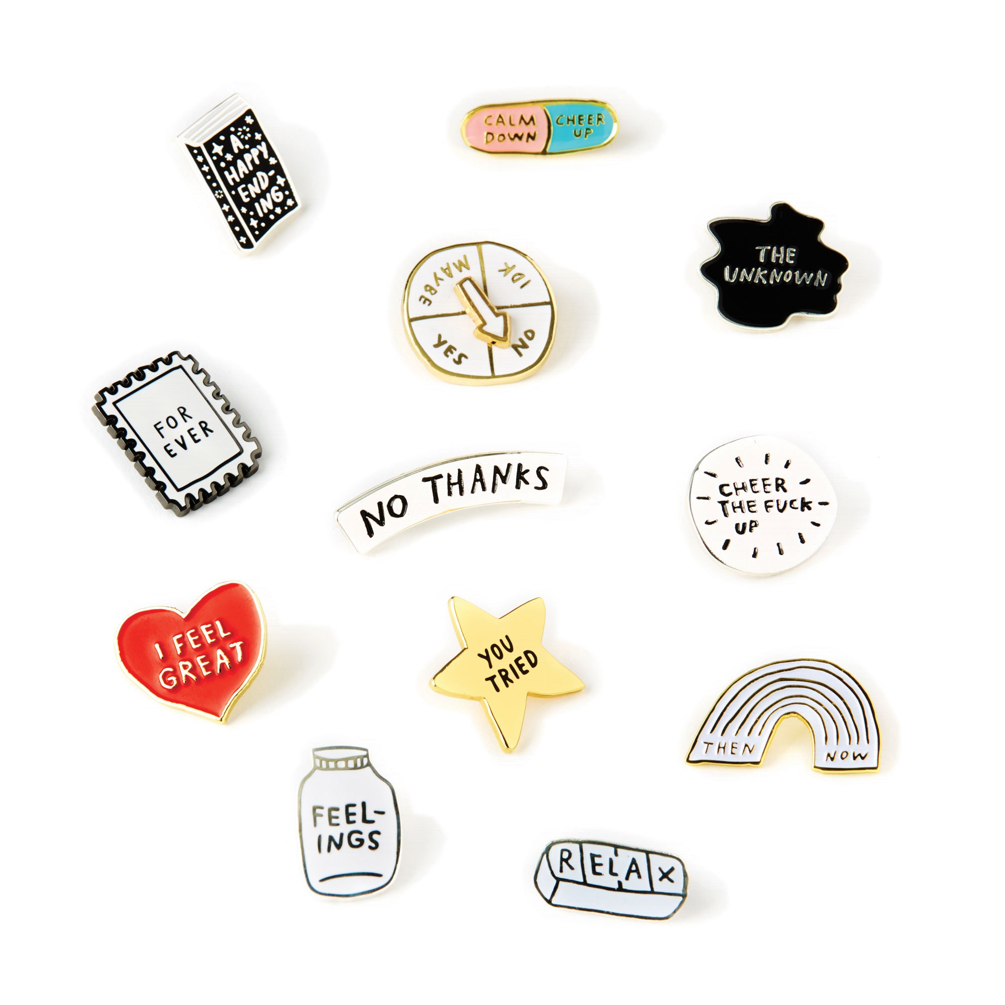 - A sample of the Adam’s quippy pins. COURTESY OF ADAM J. KURTZ.