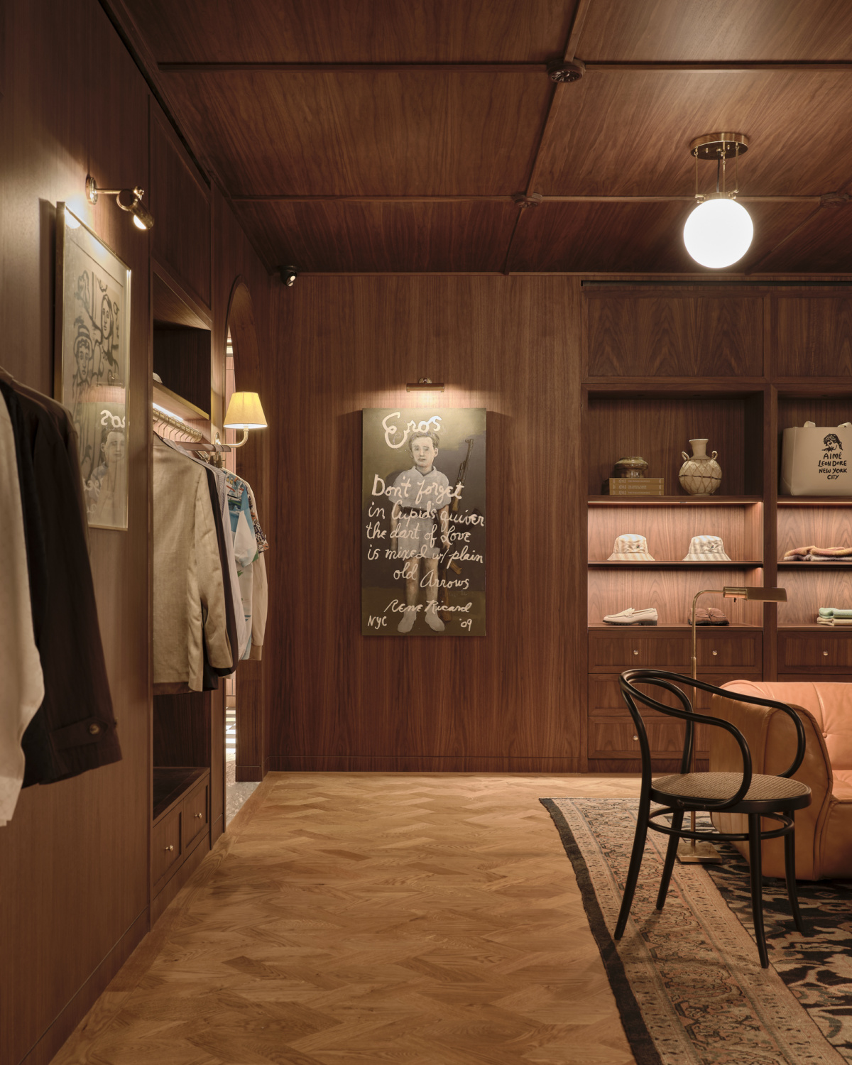 A collaboration between Teddy Santis’s lifestyle menswear brand and interior designer Sarita Posada’s vision, ALD’s new digs have traded stark white walls for warm walnut cabinetry, mid-century light fixtures, and lush Persian rugs. The redesign is virtually a twin to ALD’s London flagship, which Sarita renovated in 2022 with architectural support from HS2 Architecture and the build out and millwork completed by Taso Galitos and Chris Yerolemou of AXOS designs.