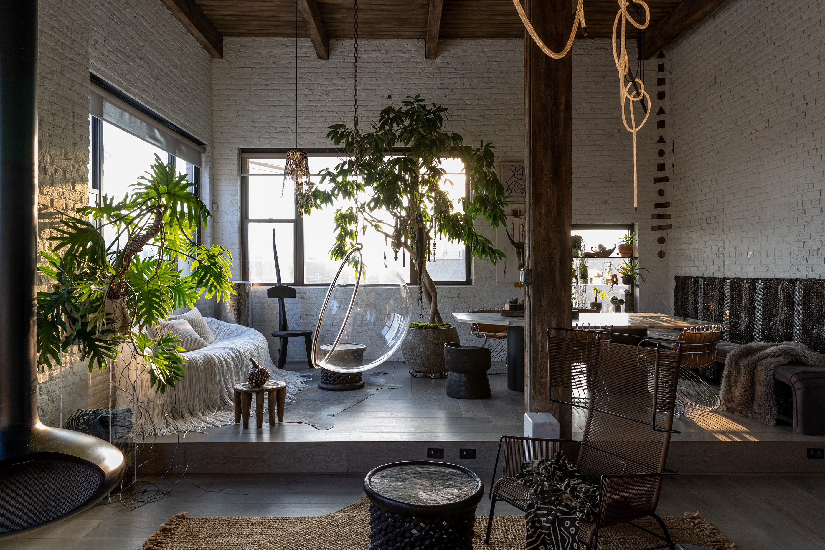 ← Hundreds of strands of white nylon rope make up the white sofa by Pedro Franco Design. The hanging porcupine quill cone light is from Ngala Trading Co.