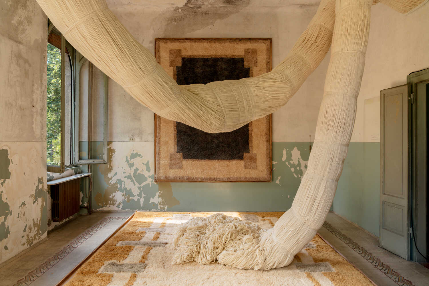 Beni Rug’s artistic director and designer stylist Colin King teamed up with artist Amine El Gotaibi to interpret the rugs as a massive rope of yarn drooping from the ceiling and high walls of their Alcova space. The beast of natural wool yarn is the very same as that used to make the rugs, which are handwoven in Morocco.