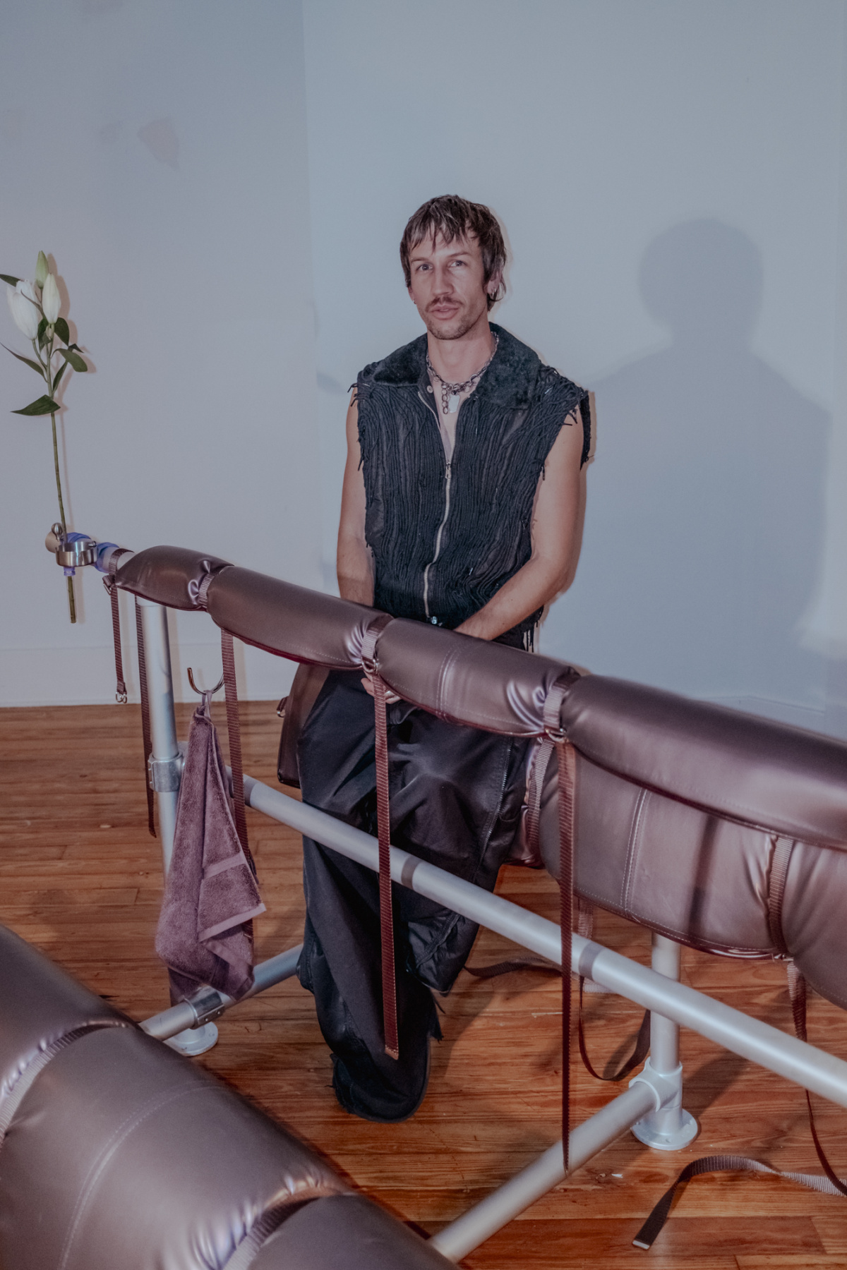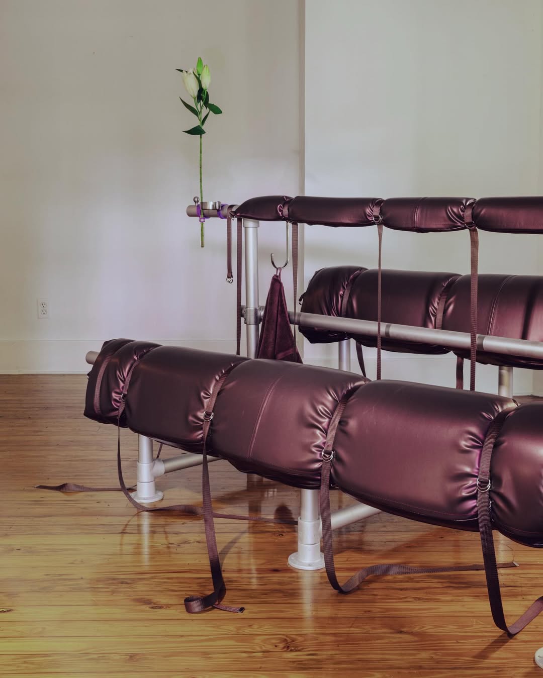 Strat Coffman, a spatial designer based in Los Angeles and Ann Arbor, made “The Railings,” a modular set of stainless steel bars and connectors wrapped with padded mats that can be assembled into a handrail -ike structure meant for touch, play, and shared movement in a room. It was originally crafted for a gay sauna in Detroit.