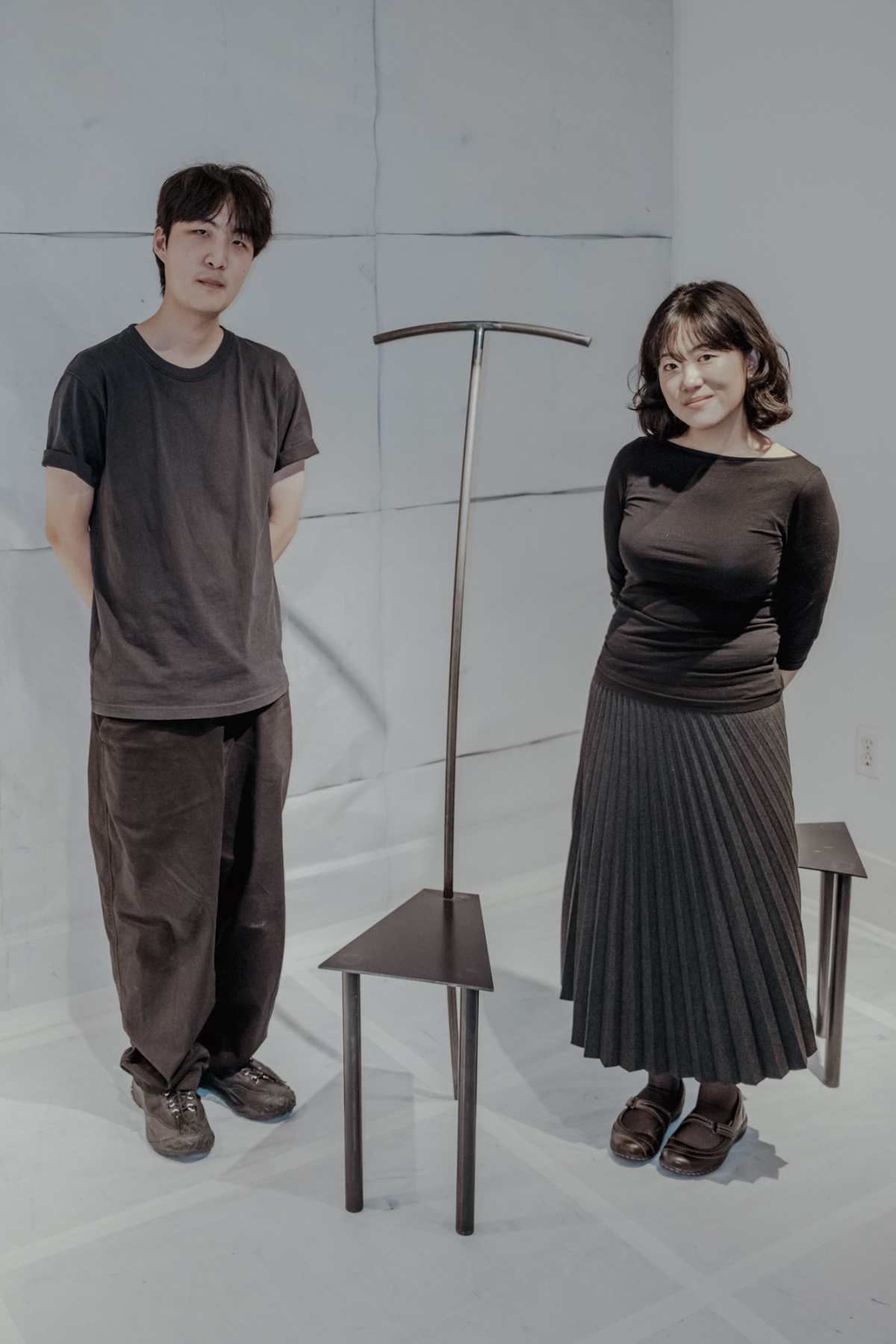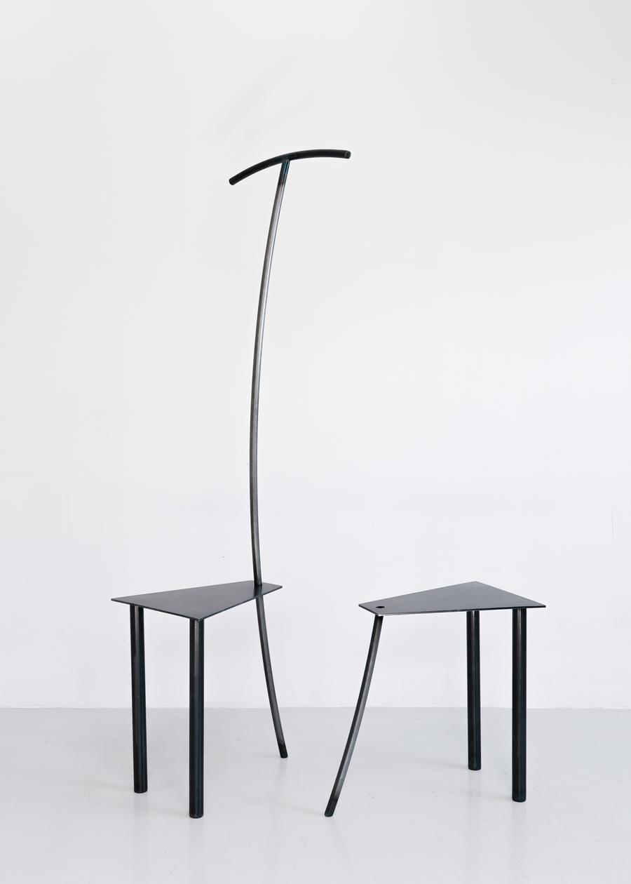 seamlessnote, a design studio in Seoul, South Korea, made the “Personal Display Series,” a two piece set in hot rolled steel including a chair meant for draping clothes and a stool that doubles as a small vase stand for flowers or objects.
