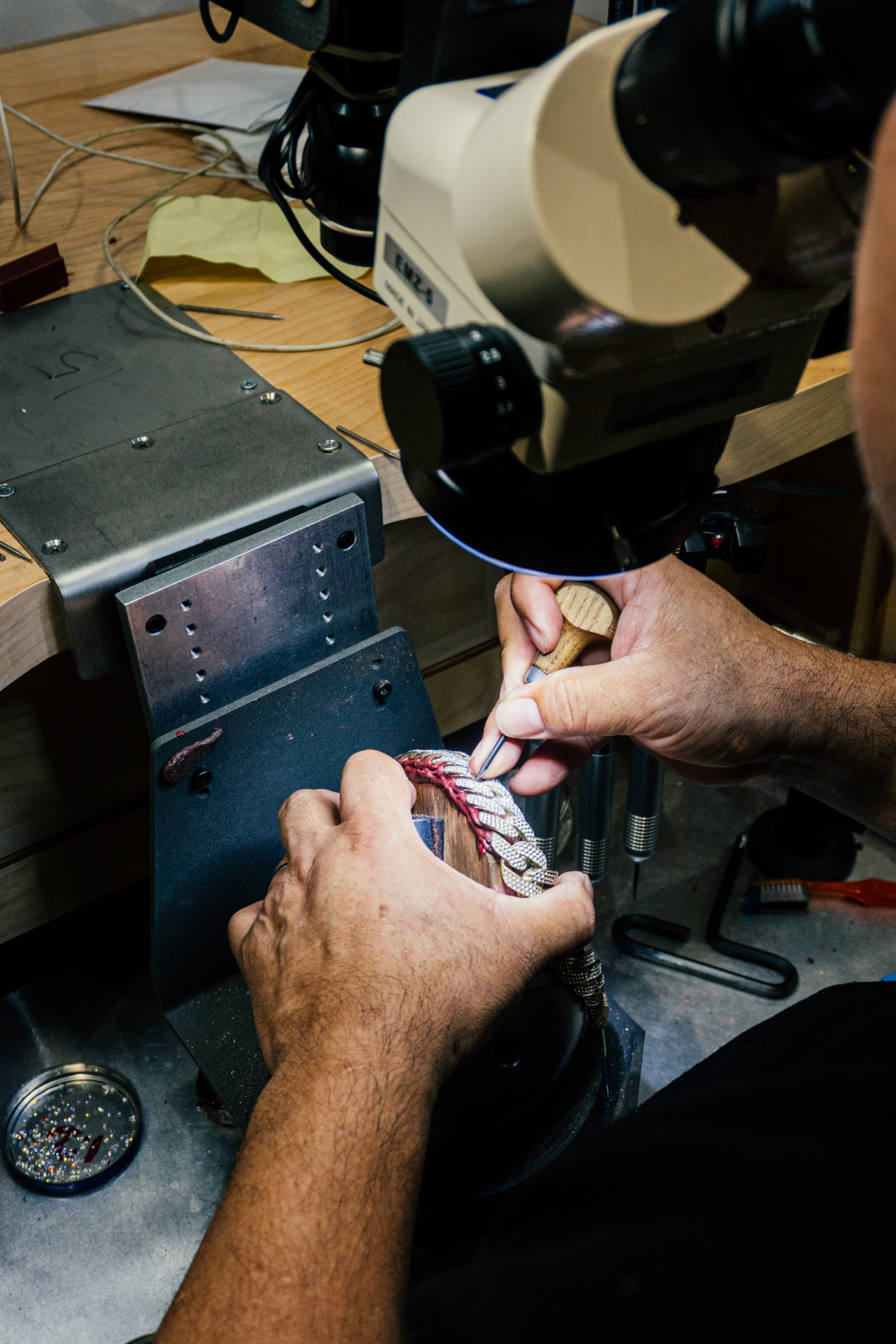 Alex wants to show me where the final work happens, so we descend to his factory, down to the labyrinth-like third floor—traveling through a door and then another door. (Yes, multiple Uncut Gems references were made.) This two-part setup is where Alex watches his ideas come to fruition. In one room an employee physically makes and molds the jewelry, using fancy equipment like steam and laser machines. That same person then sends the jewelry to the other room, where three workers undertake the painstaking task of setting the diamonds. Once complete, it returns to the first room, and a few final steps complete the product. Since Alex works with a lot of white gold, this often involves dipping it in rhodium to give the piece a shiny appearance.