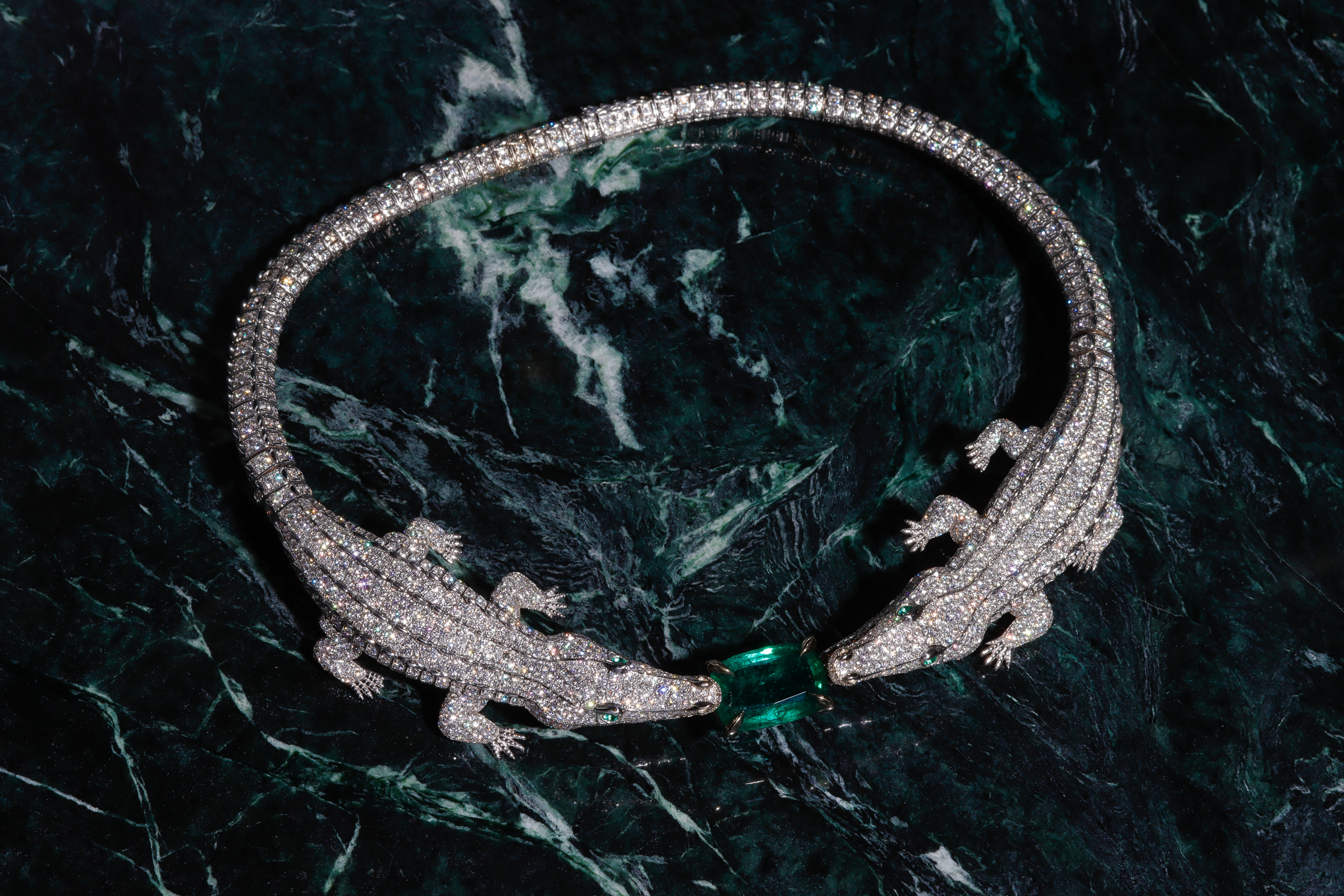 What’s on his agenda now? Bella Thorne sent her Florida-inspired necklace back to be resized (it’s a choker with two alligators at the middle, joined by an emerald), and Tyler, the Creator has a new set of five diamonds pins in progress. Then there’s the ring Alex is designing for Drake—an ornate owl accompanied by the number 11.