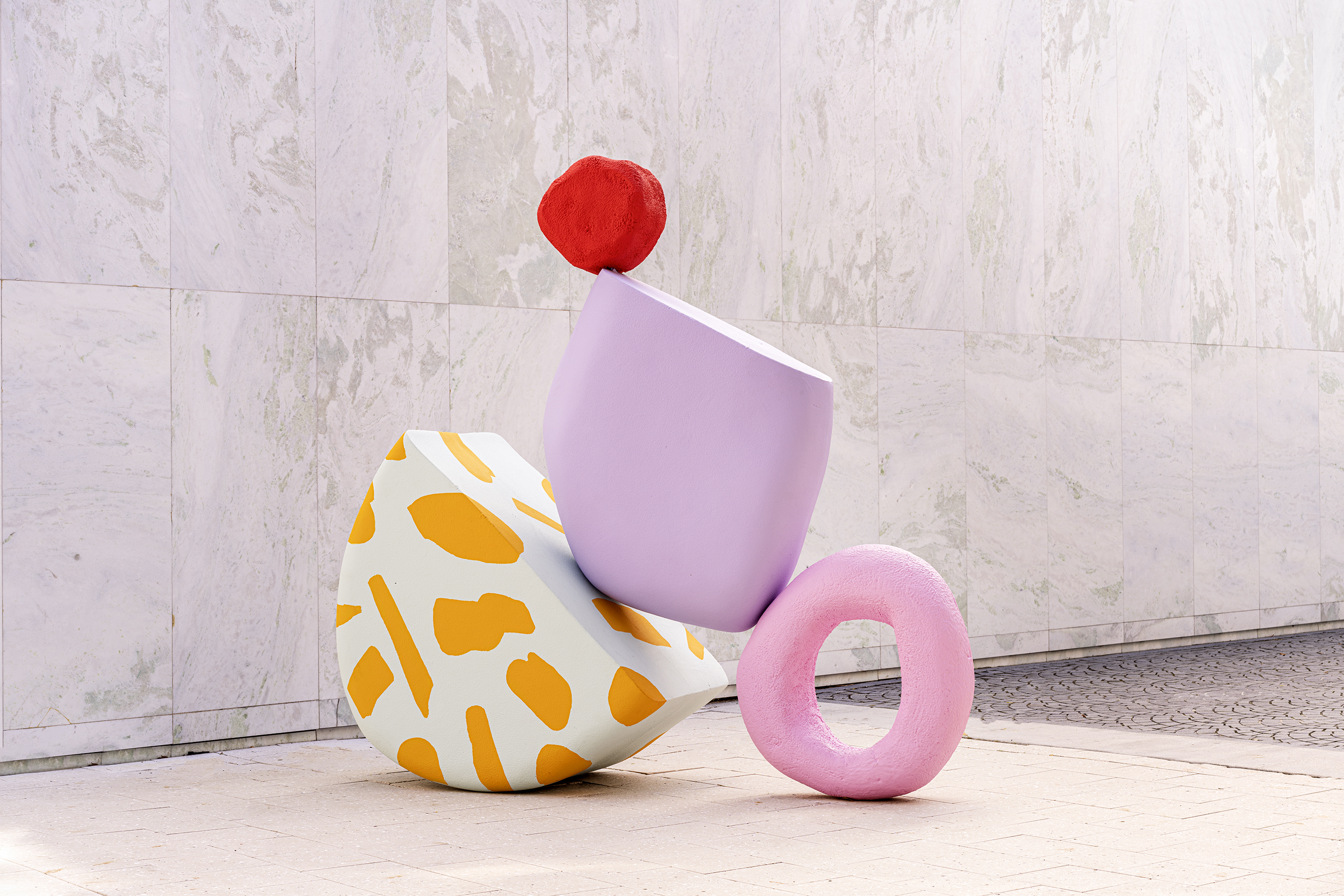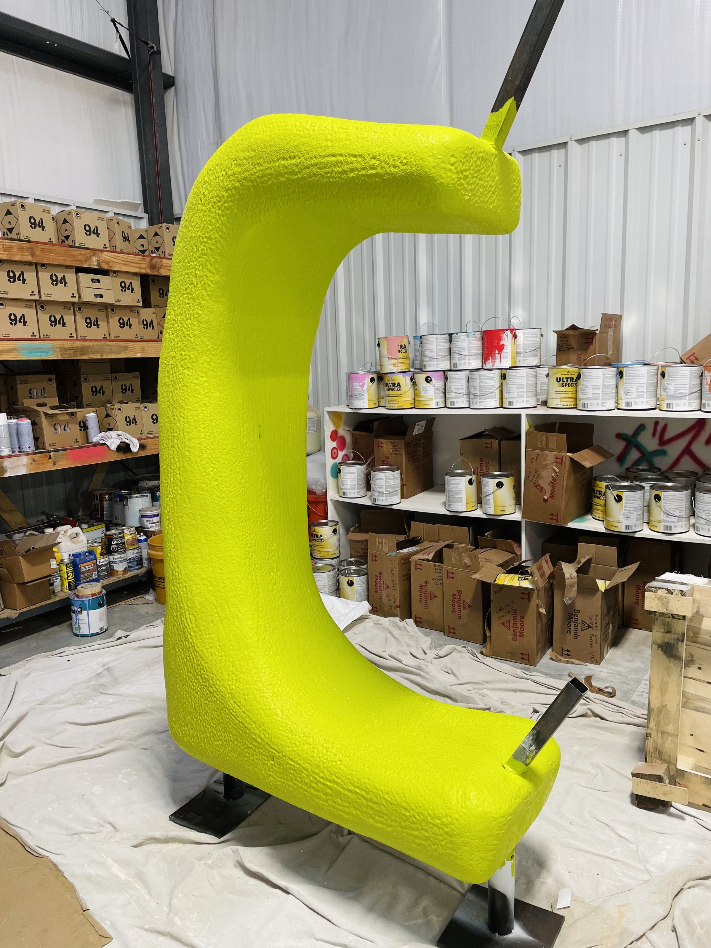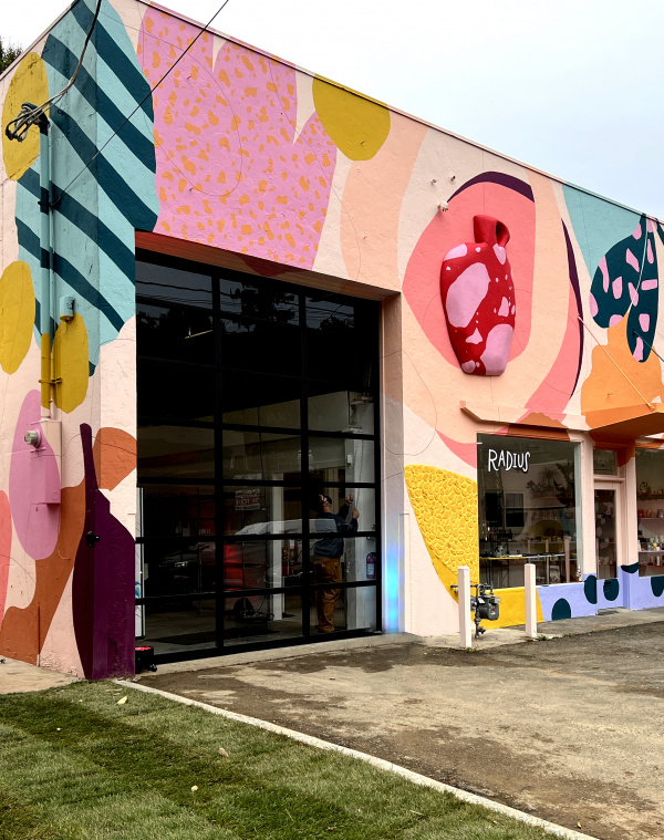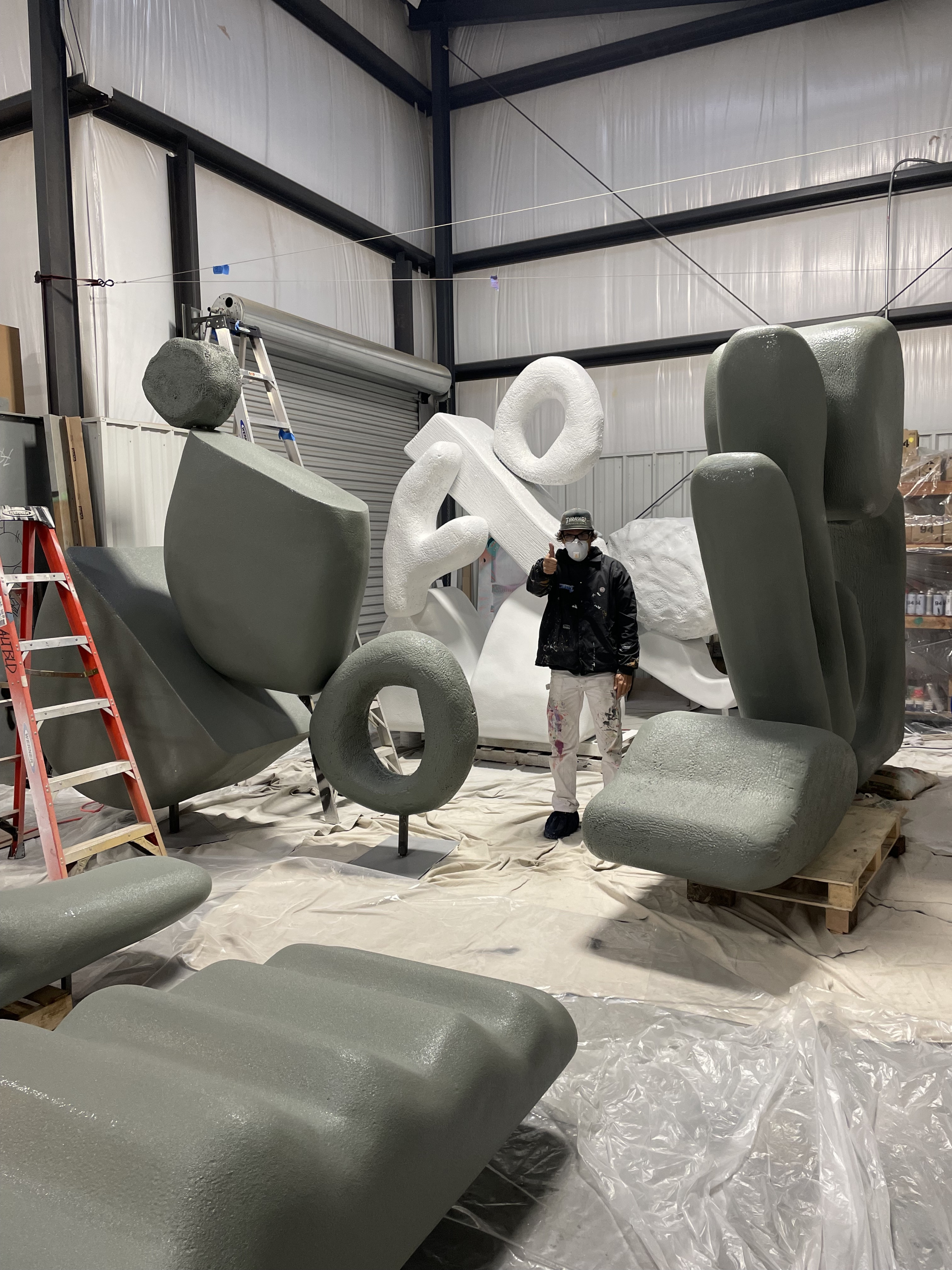 Alex’s new studio is a giant, open space with painting supplies, canvases, bright colors, brushes, and, of course, her dog and “best assistant” Sam. The solo show, Gemstone Groceries, is coming together. Originating from her Design Miami 2021 installation, Tomorrow Land, the idea is to bring sculpture and big, lively, interactive art to the scale of the living room.