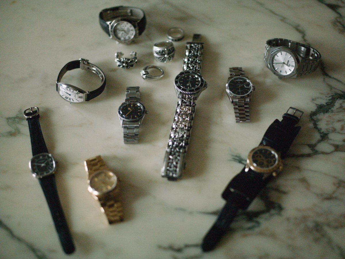 “Time moves fast. That’s why I have a huge obsession with wristwatches, especially old ones. They’ve become like breadcrumbs through my career. I can look at a piece and remember what was happening when I got it, almost like memorabilia,” he says. Photo by Noah Agemo