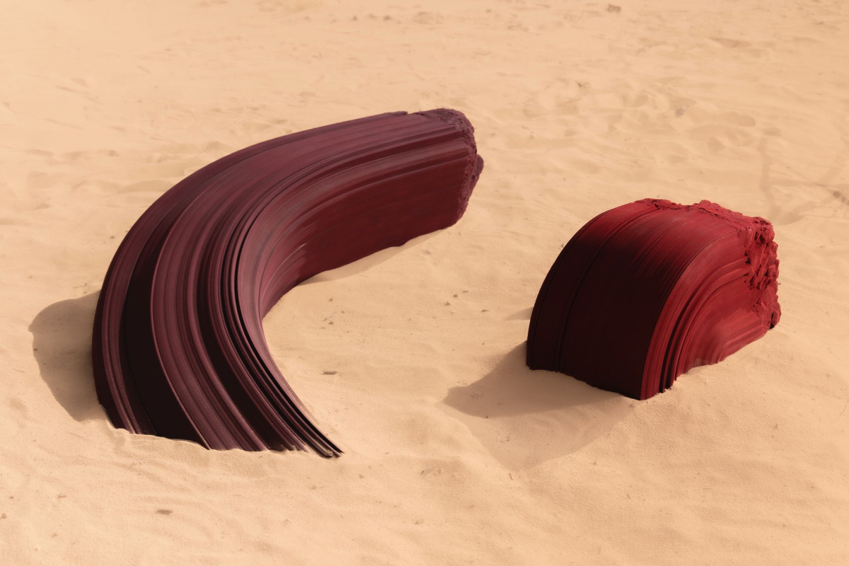 Aseel Alamoudi began her residency observing the children of the city engaging in freeform play in open spaces. At the same time, she explored the texture of the region’s sandstone formations in material extrusions. The two ideas merge in the vibrant red bench and stool she showed at ’Material Witness,’ alongside a miniature mockup of her complete vision: a full-size material extrusion in the shape of a curved, slidable, climbable, sculptural play structure.