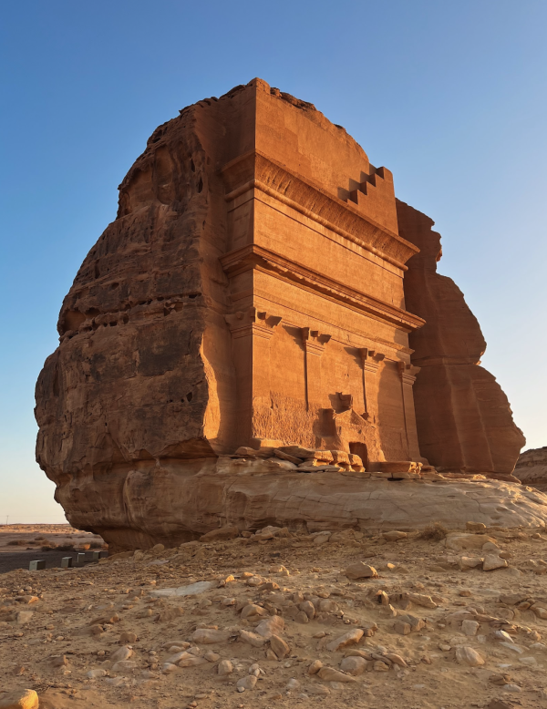 It’s silent in the Saudi Arabian desert, where sandstone formations scrape the sky, capped with boulders like heads. Loose sand ripples with waves from the wind, disturbed only by the footprints of desert foxes—and now, humans. High above circles an eagle, a symbol of immortality and the gods’ protection to the ancient Nabataeans who once lived here and carved these mountains in the oasis city AlUla.