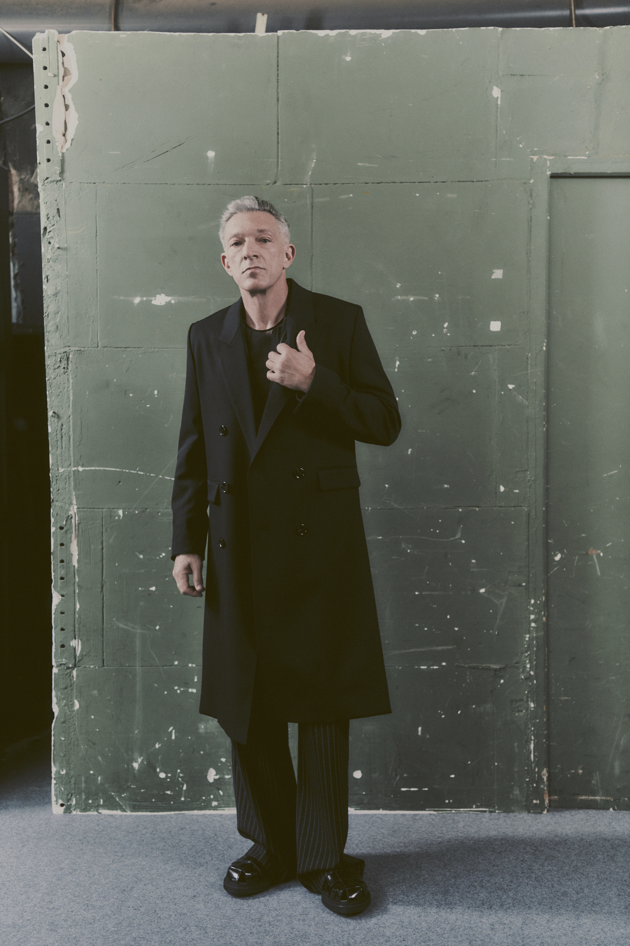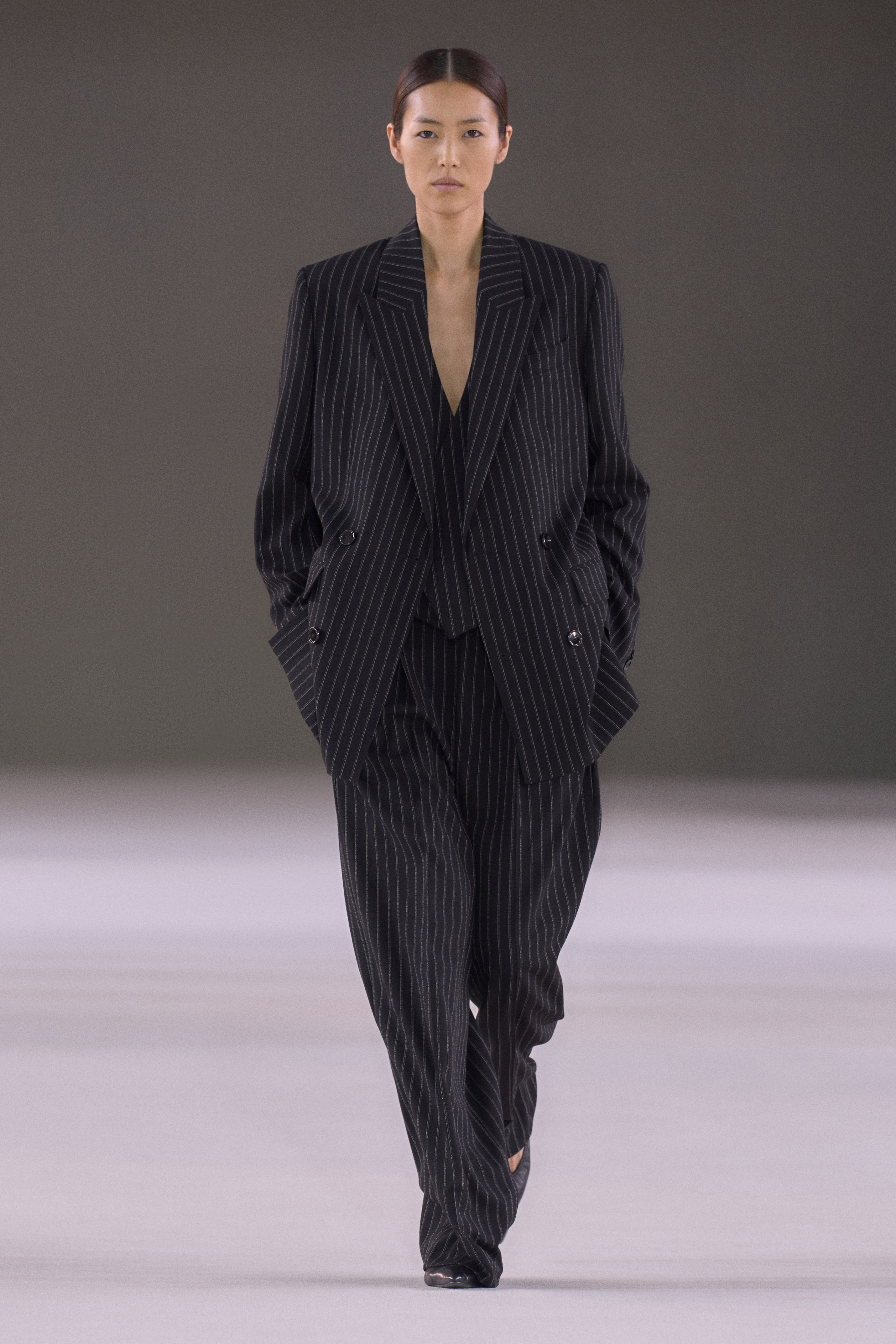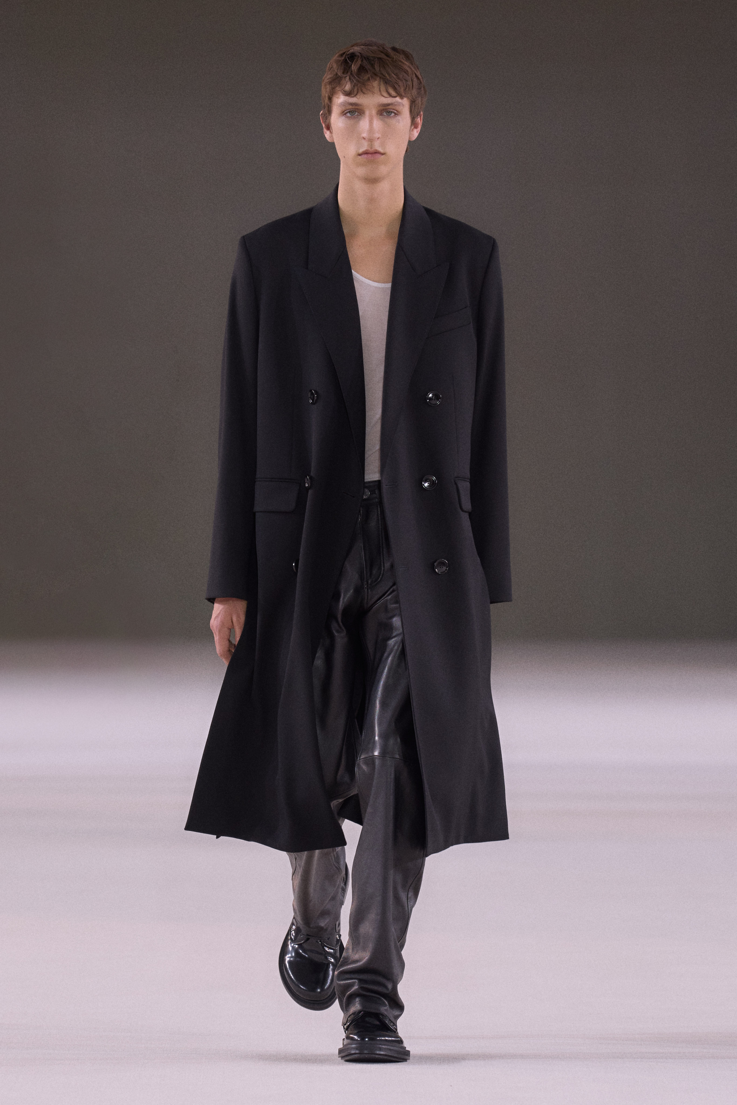 Actor Vincent Cassel opened the show, walking the runway in a long, black overcoat, and an open pinstripe suit that revealed a fitted mesh top underneath. The coat’s square shoulders belied expert tailoring, but it otherwise had an oversized form that was matched by the roomy pants. Relaxed fits dominated the show, a nod to the era of Calvin Klein and Helmut Lang.