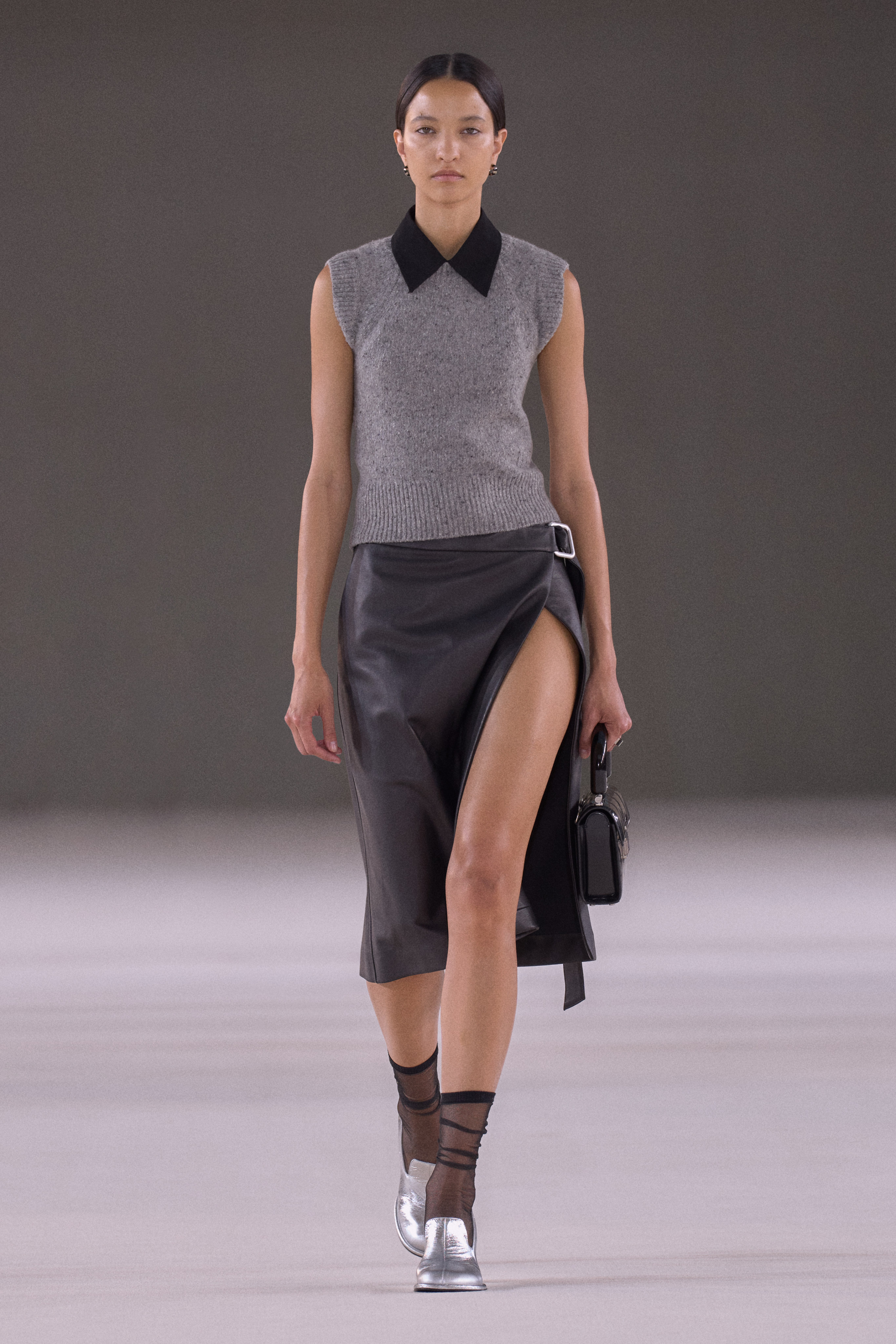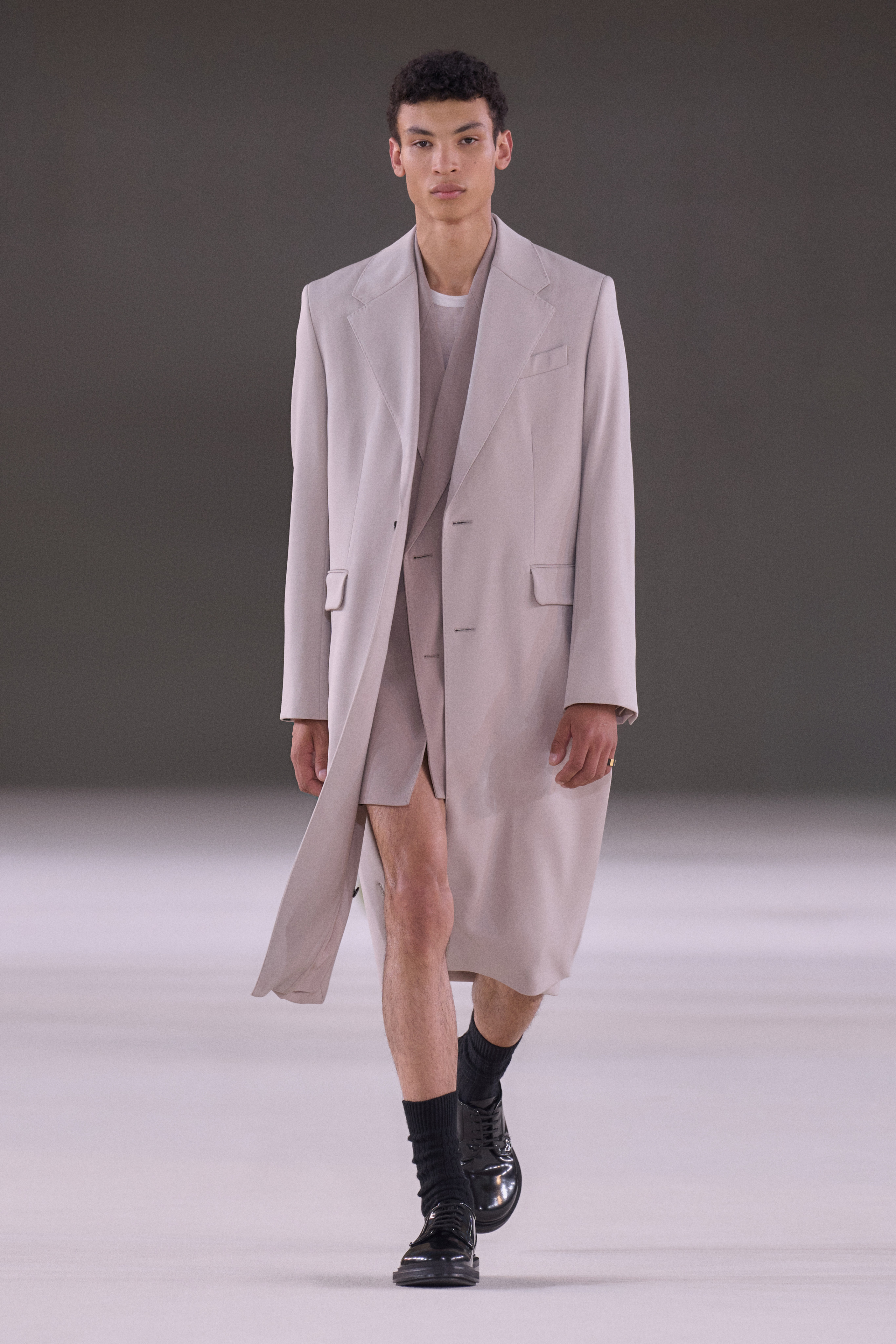 That is just one of many styling moments that snuck sex appeal into the baggy collection. Shorts with tiny inseams and skirts with high slits showed skin on the runway. Loose ties communicated a casual, flirtatious tone. Oversized silhouettes might initially read conservative, but they slide off much faster than tight clothing.