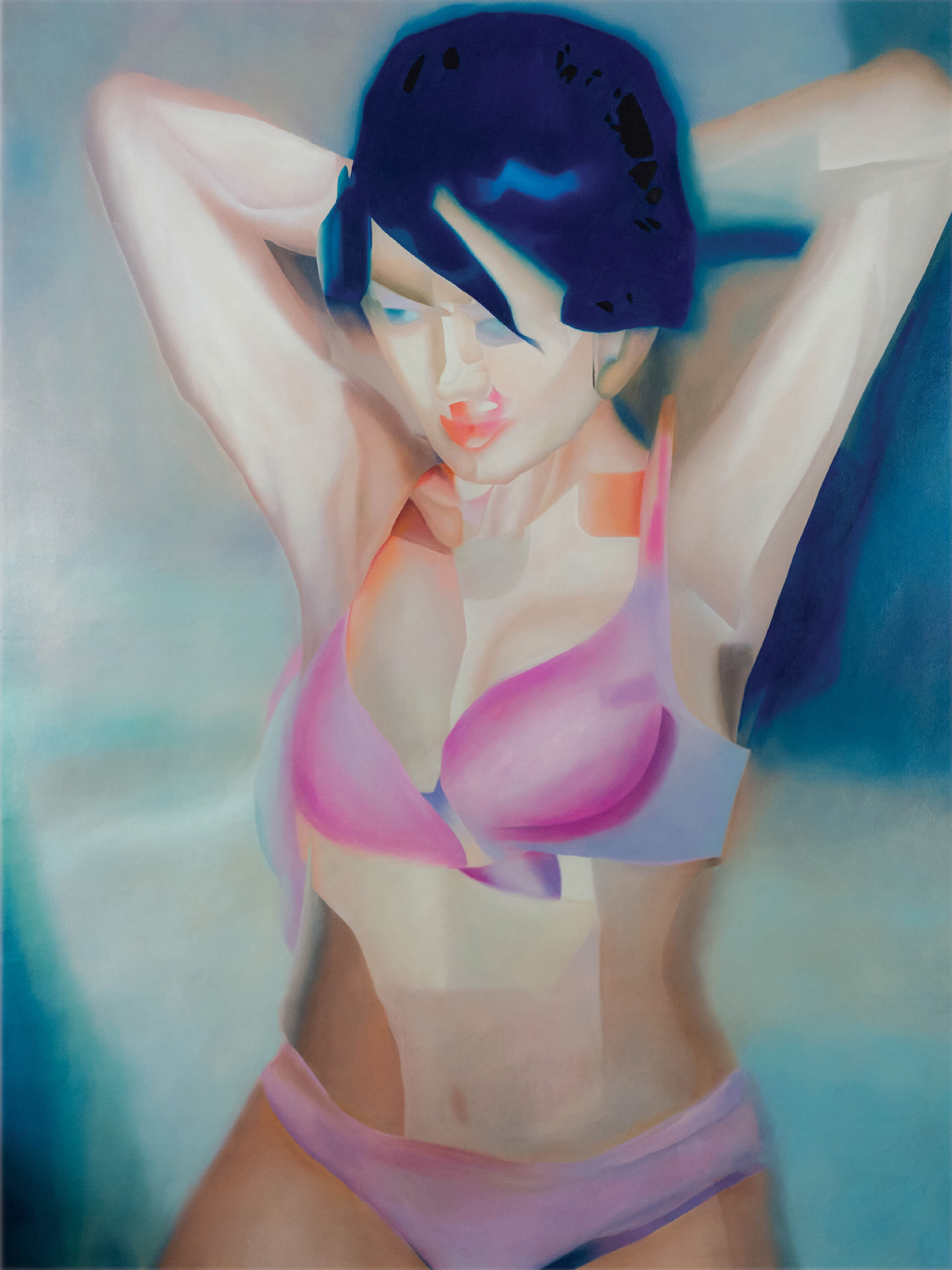 I love the synergy between the manual and digital. Sharp digital brushstrokes combined with the softest blurred areas are two stylistic elements that are typical for my paintings; I really enjoy that contrast. I’m also embracing the digital anomalies that happen throughout the process—the things I haven’t planned. Furthermore, by digitally disrupting the classical oil painting process, I’m commenting on the male dominated industry and the depiction of women throughout history.