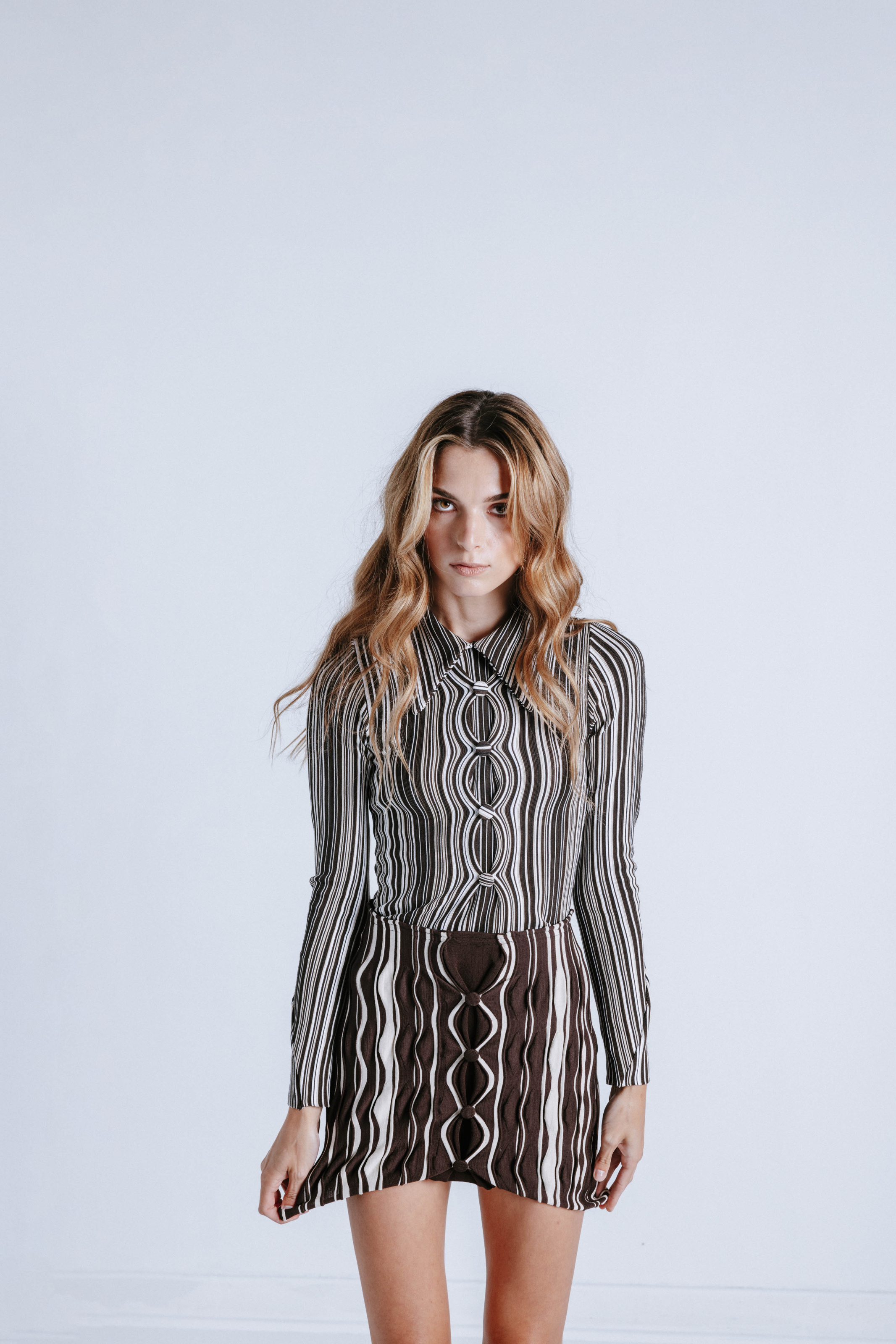 ← Anne Isabella is reviving the spirit of the 1960s and ‘70s. In her most recent collections, the Danish-French fashion designer weaves vintage inspiration into playful prints, intricate detailing, and precise tailoring. “The stripes on the Lenticular pant are lasered-printed in Italy,” she says. “It’s a very complex process. Each side—the pocket, front, and back—all have a different design made for that piece. The design follows the shape of the pocket, giving it a warped illusion.” The swim top pulls from more organic visual motifs. “The ‘60s and ‘70s are always part of my research. It’s an underlying theme that runs through the brand. I was looking at a lot of elements from nature—like the formation of shells and natural patterns.”