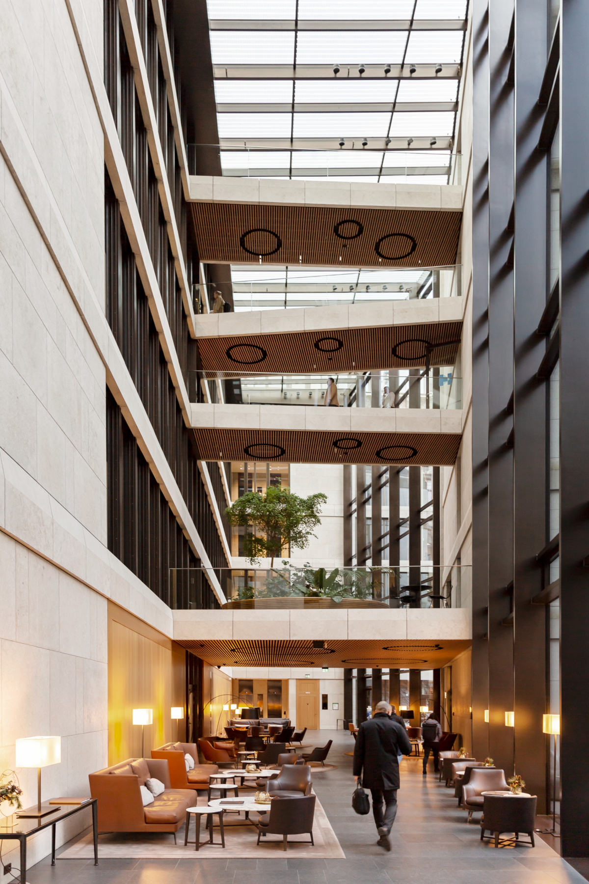 The recently completed Building D offices by ACPV in Milan’s Symbiosis business district is another meeting place, and it’s designed to attract people to work on the premises. The office building interacts with the area’s existing buildings and surrounding green public areas and emphasizes energy-efficient design.