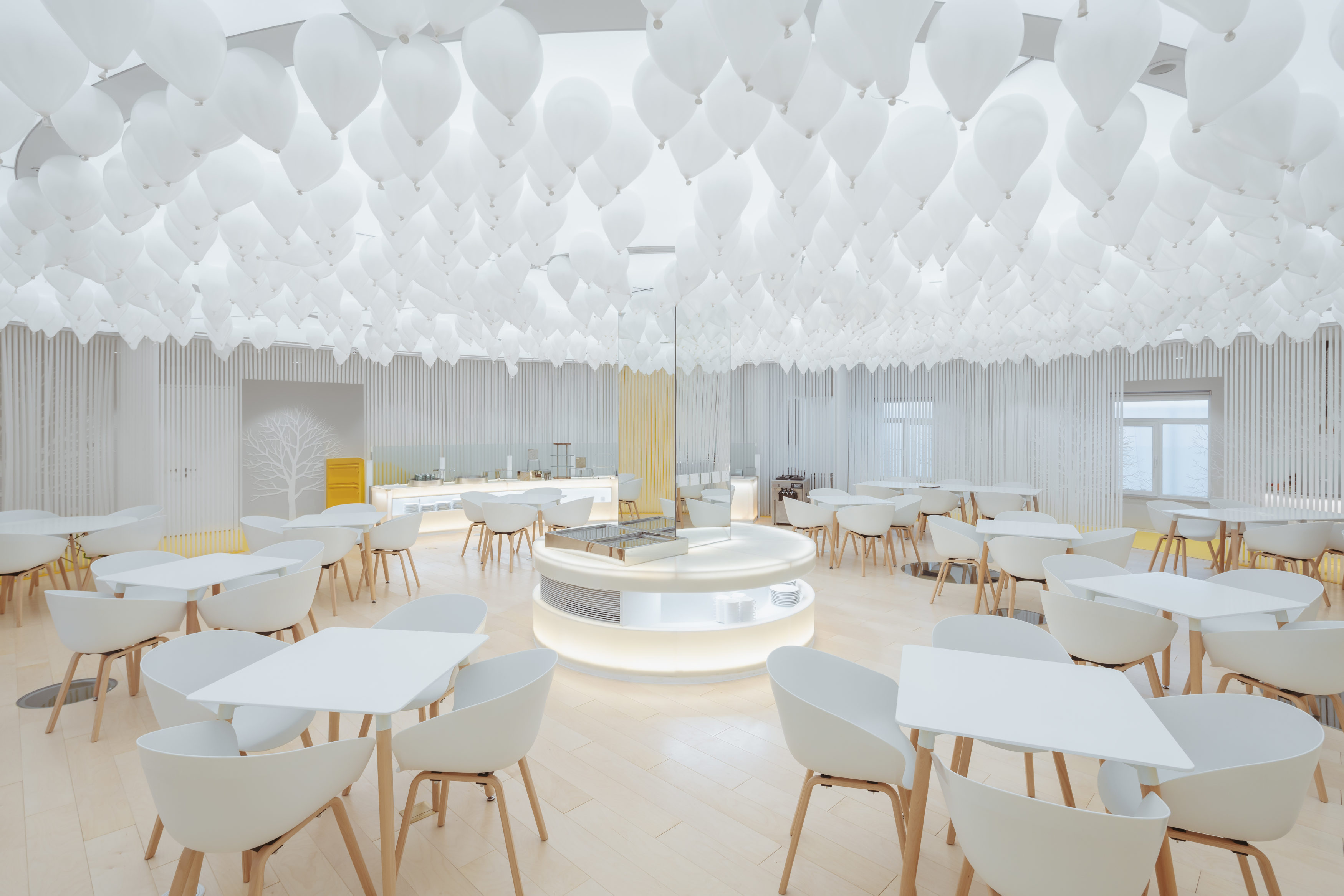 Balloons float along the ceiling in the vivid white dining area. COURTESY OF CREATAR IMAGES.