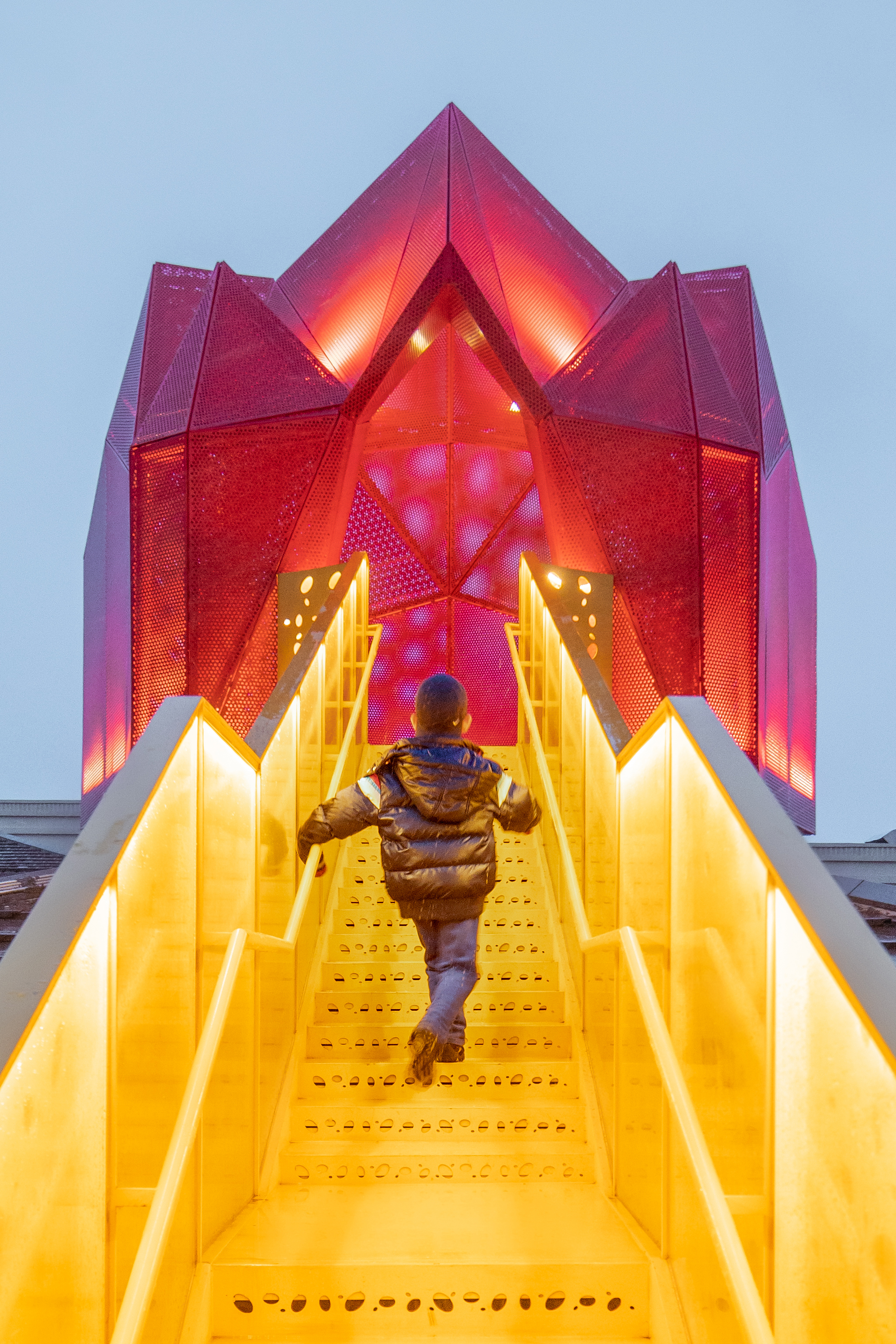 “Gimmicky and childish design does not interest every child,” says Yu Ting, architect and founder of Wutopia Lab. His young daughter was never drawn to colorful, cartoonish spaces. That’s why Yu opted for muted colors and translucence in his design of Aranya Kid’s Restaurant, which opened in May 2018 in Qinhuangdao, China. Also known as Polycarbonate Neverland, Wutopia Lab created every part of the restaurant with a sense of make-believe in mind. The design team renovated part of a clubhouse—less than 1,000 square meters—to make a creative space for kids to eat, adventure, and let their imaginations run wild. Matte PVC piping encloses a circular dining hall and two private dining rooms surrounded by transparent panels form a translucent facade. The play area at Aranya is scattered with large bubbles made of PVC. The starry sky ceiling and magic mirror around the space add to the otherworldly aesthetic while circular, diffuse lighting and white tones create a whimsical feeling. But one of the restaurant’s most striking features is the red flying house on the roof. This brightly colored structure is made of double perforated aluminum panels. It makes the building distinctive and easy to spot, like a lighthouse in the distance.