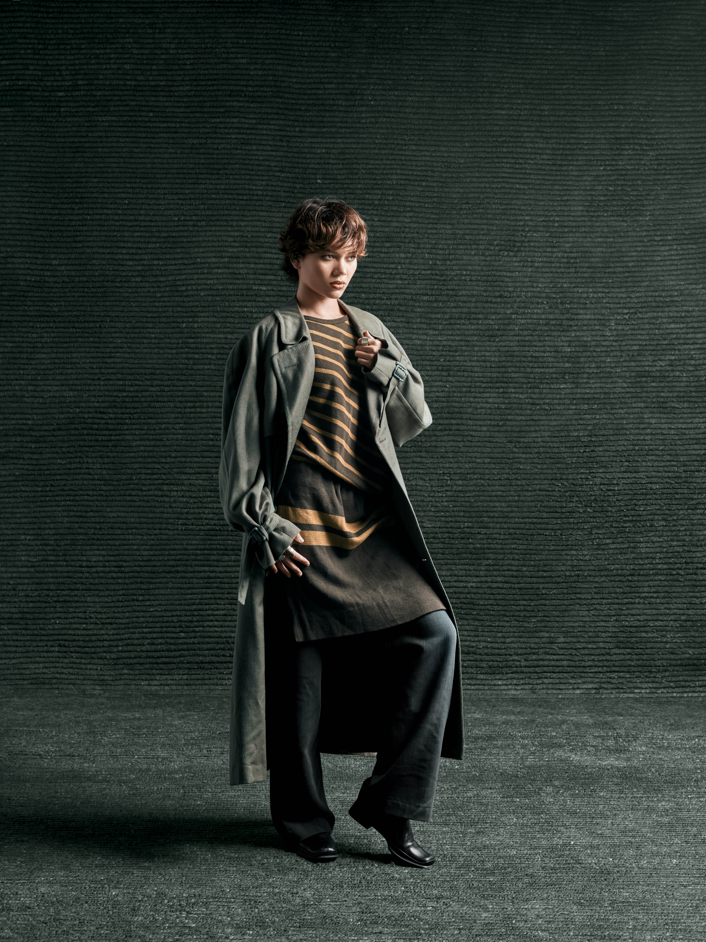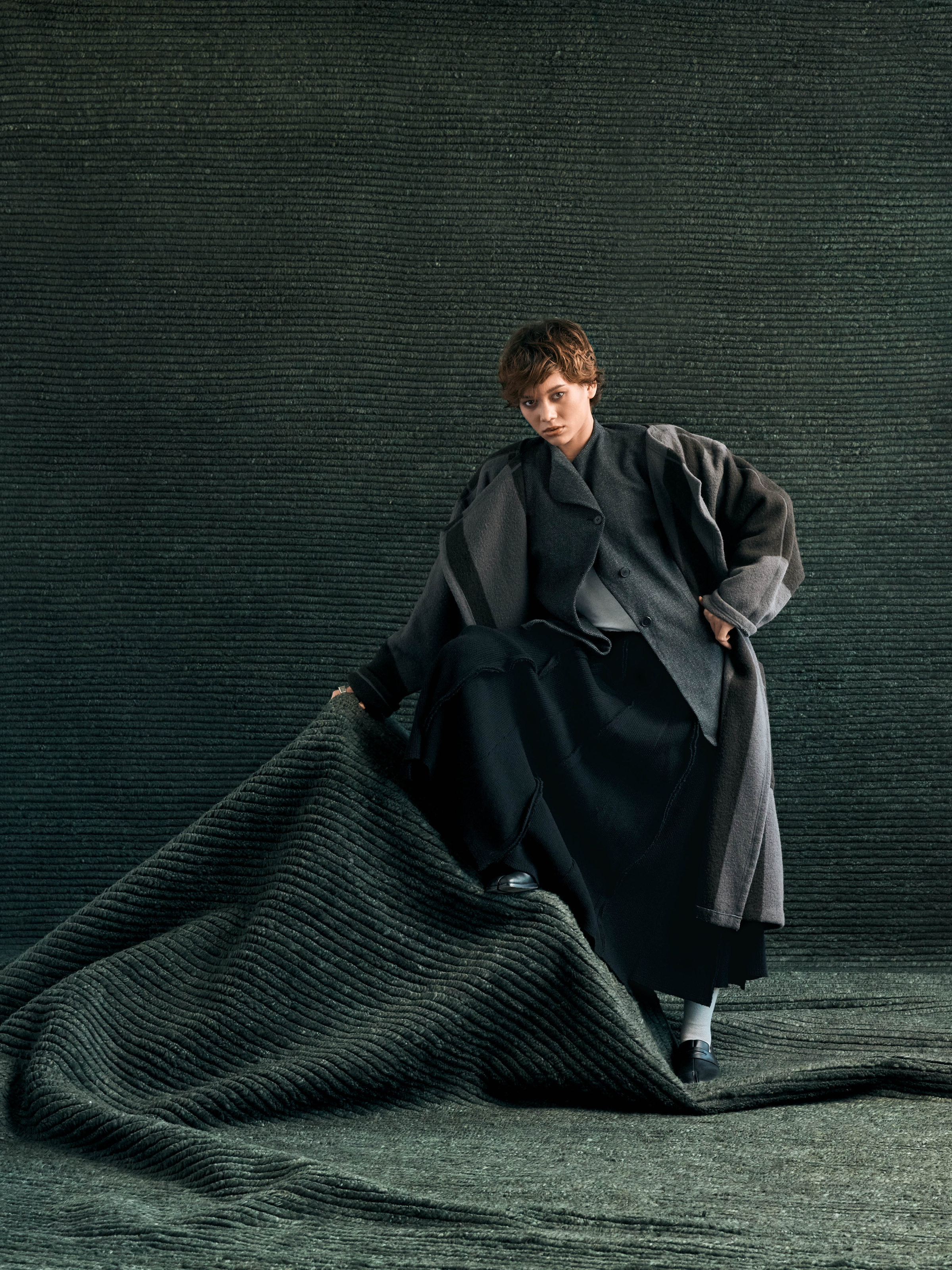 Malawi rug in Kelp by ARMADILLO. ‘80s ISSEY MIYAKE wool coat. ‘90s GIORGIO ARMANI blazer. Vintage cotton tank. COMME DES GARÇONS F/W 2002 ready-to-wear skirt. MAISON MARGIELA loafers