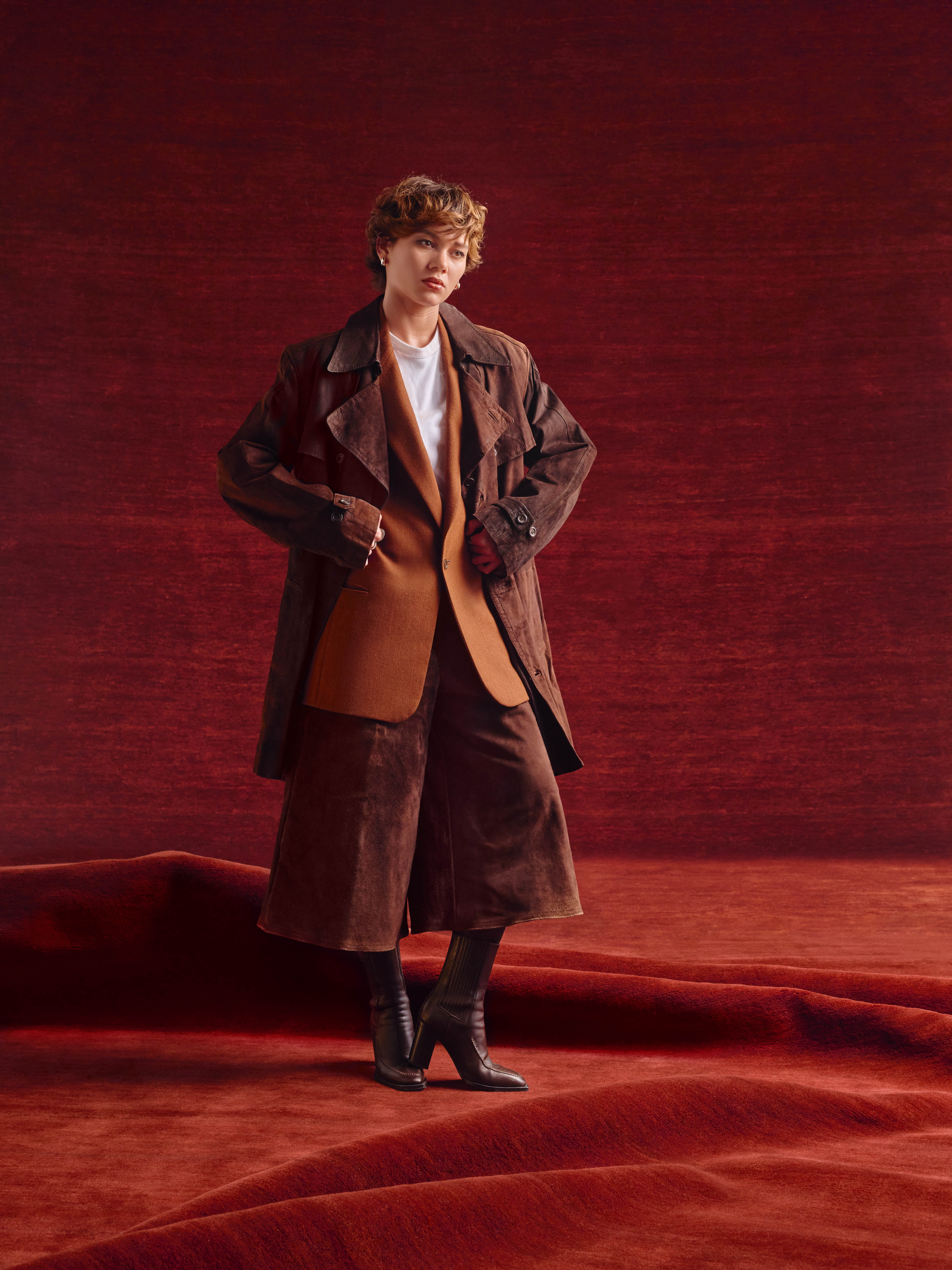 Agra rug in Burnt Umber by ARMADILLO. Vintage suede coat ‘90s DONNA KARAN blazer. Vintage cotton tank. Vintage suede culottes. COSTUME NATIONAL boots.