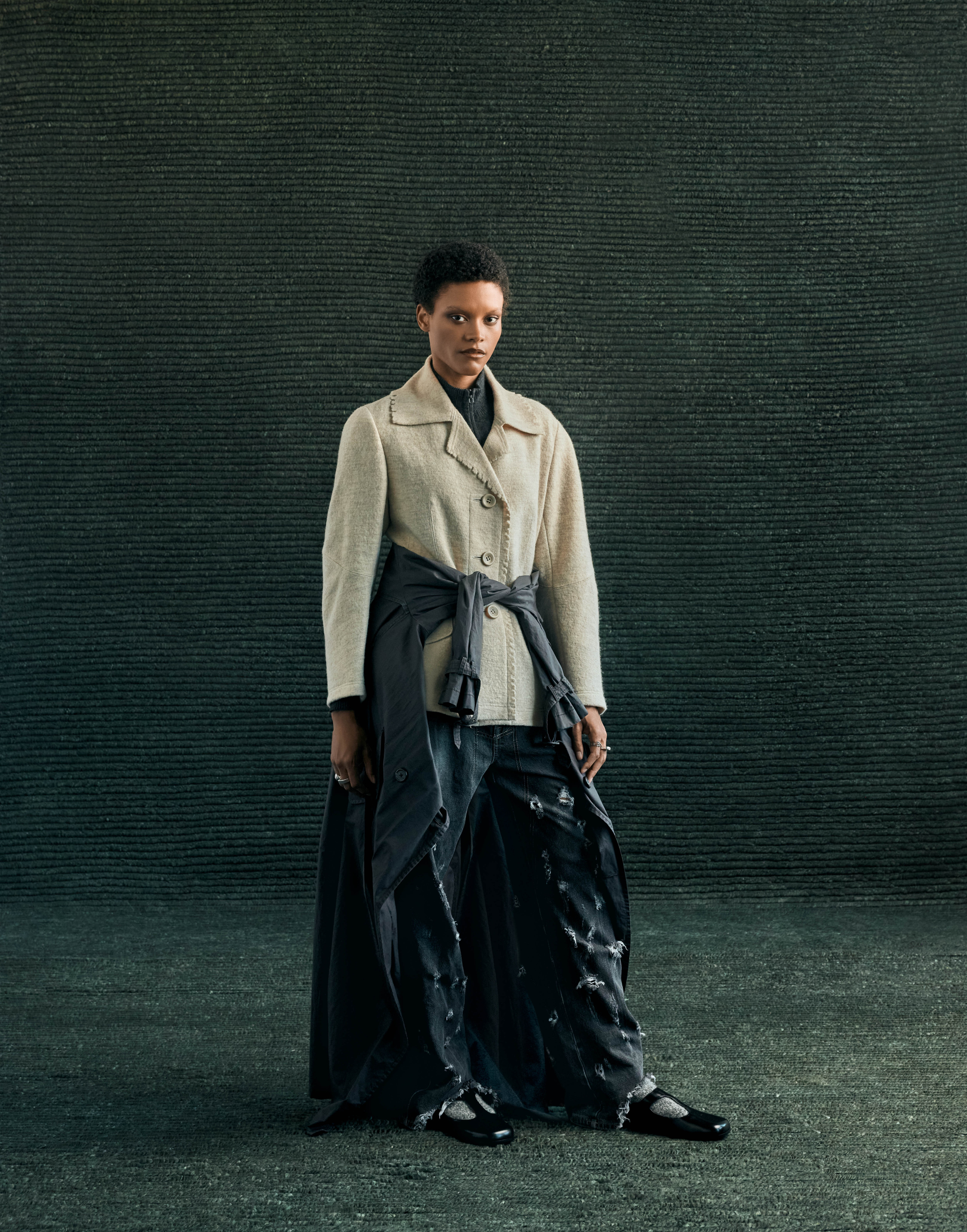Malawi rug in Kelp by ARMADILLO. ISSEY MIYAKE F/W 1996 ready-to-wear jacket. ‘90s MARITHÉ + FRANÇOIS GIRBAUD jeans. ‘90s RALPH LAUREN trench coat. Kiera shoes by TORY BURCH.