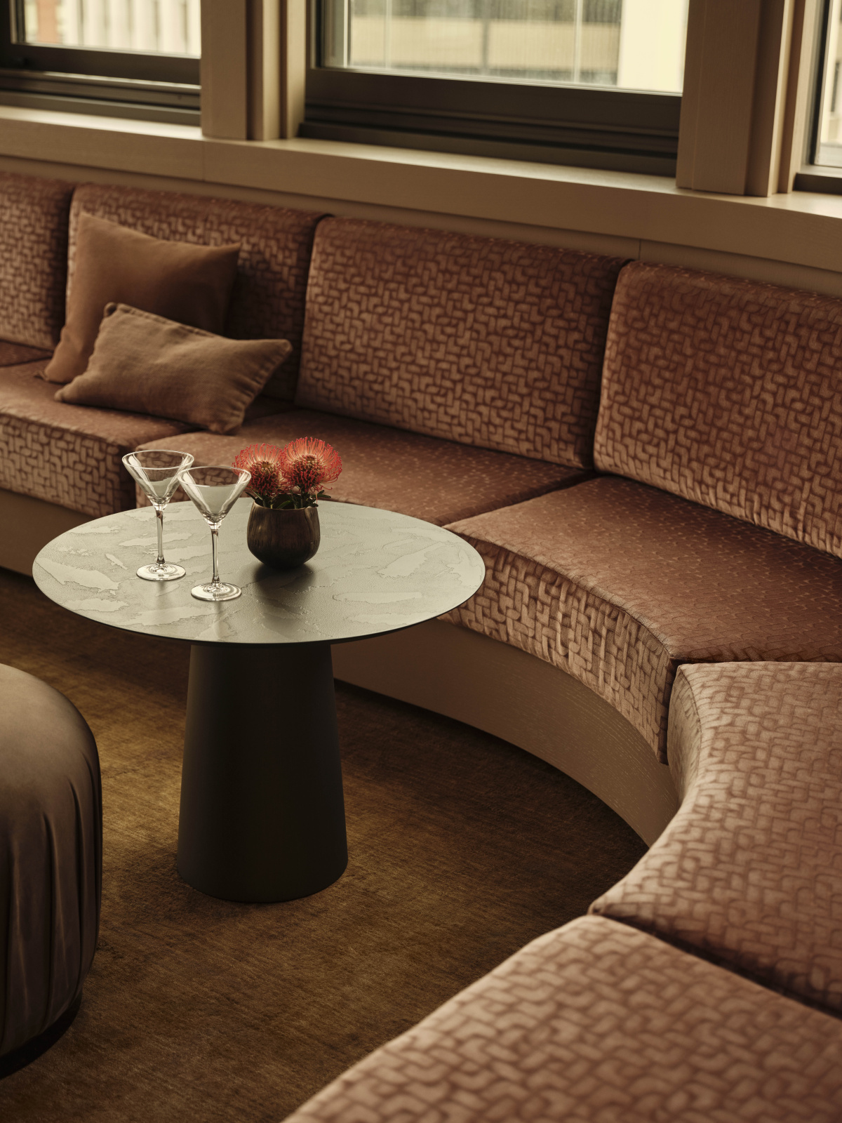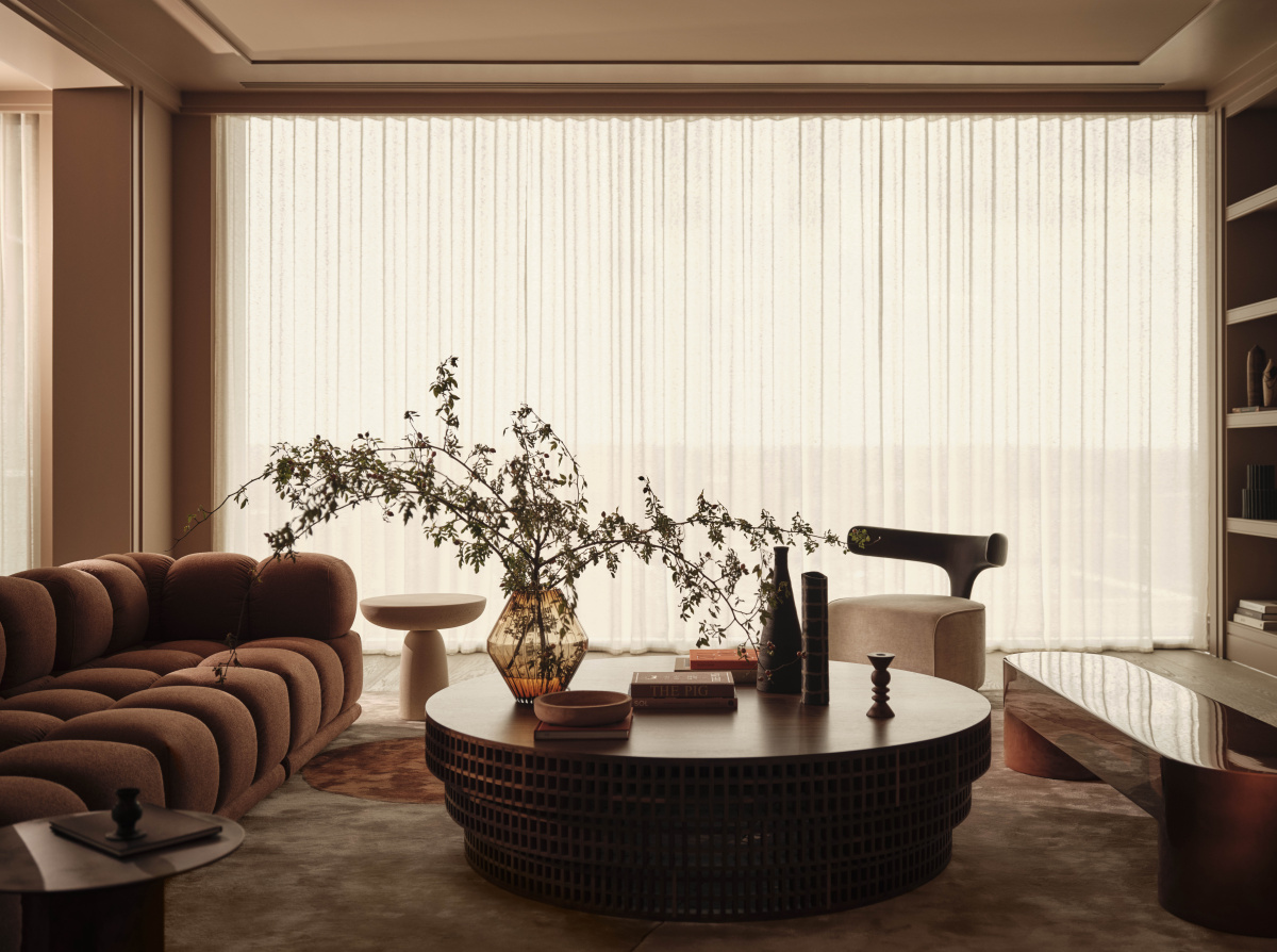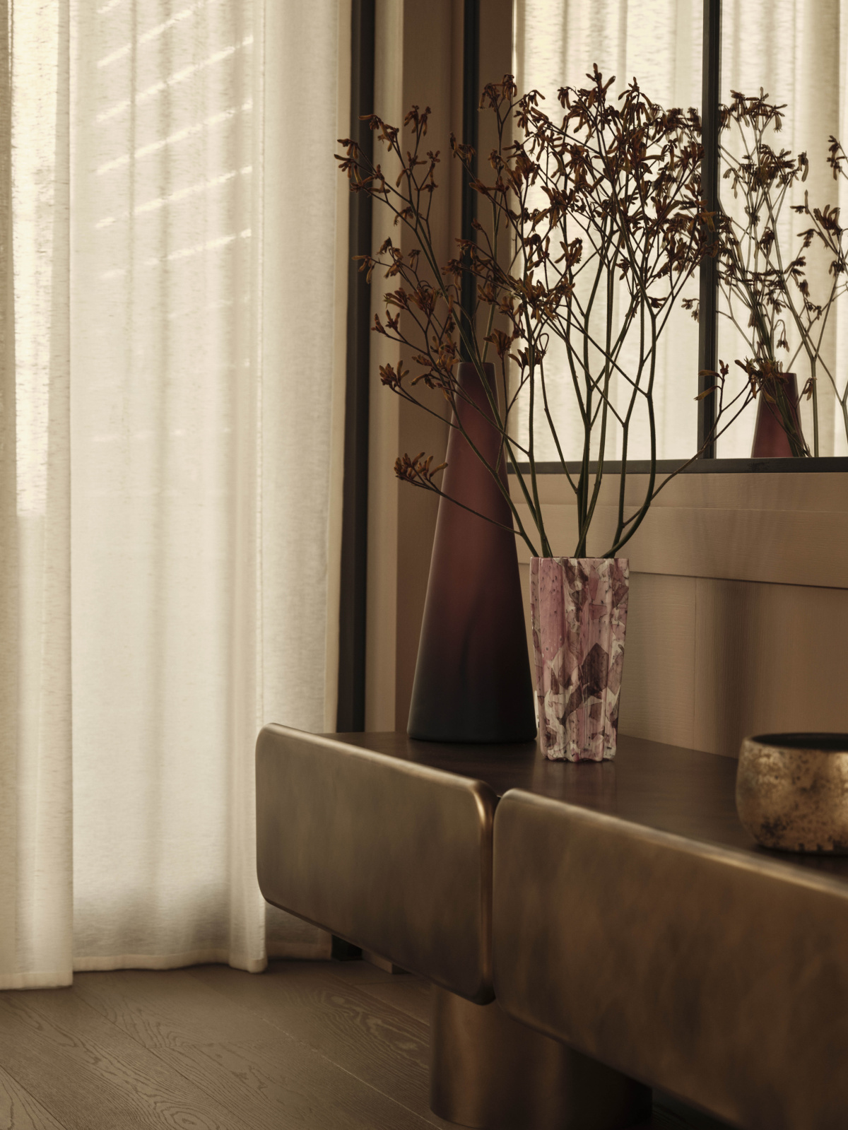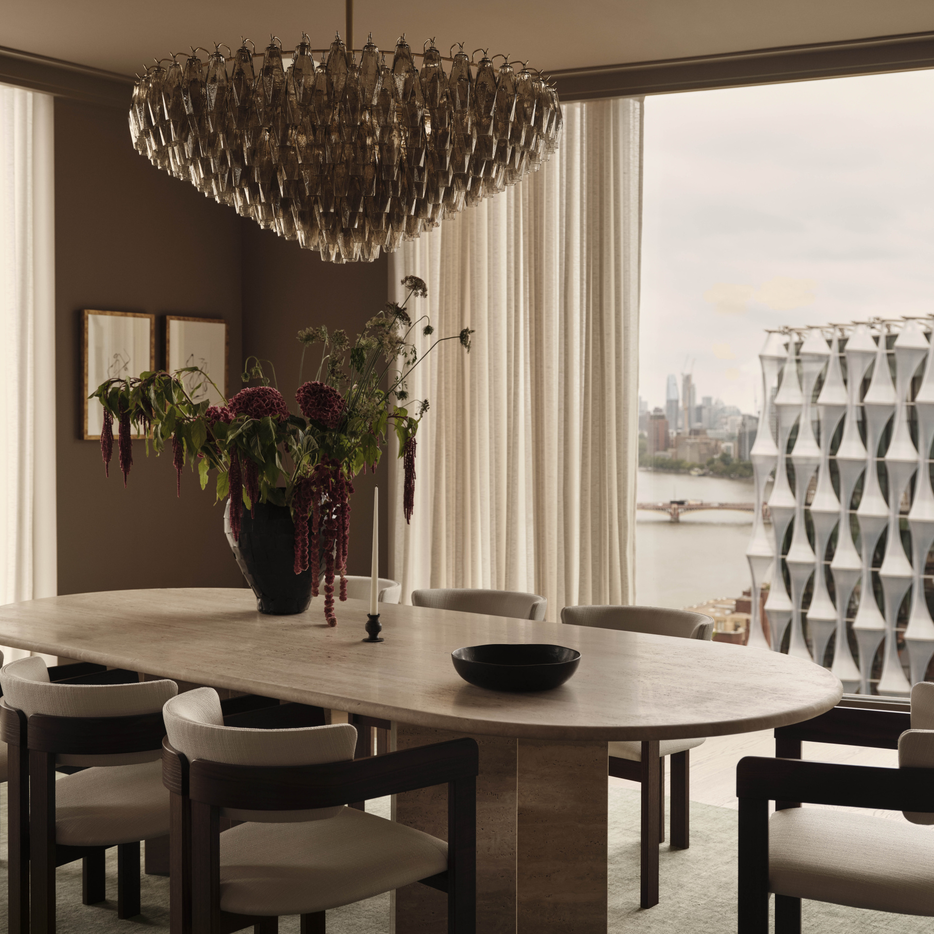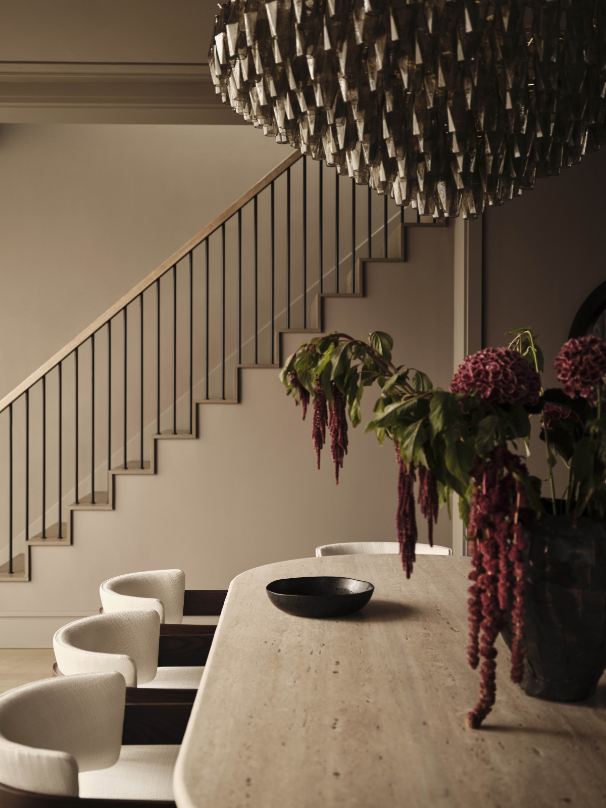 - Refined materials and warm tones are incorporate througout, reinforcing the penthouse’s cohesive design language. Above: Geometric Smoke chandelier, City Travertine dining table