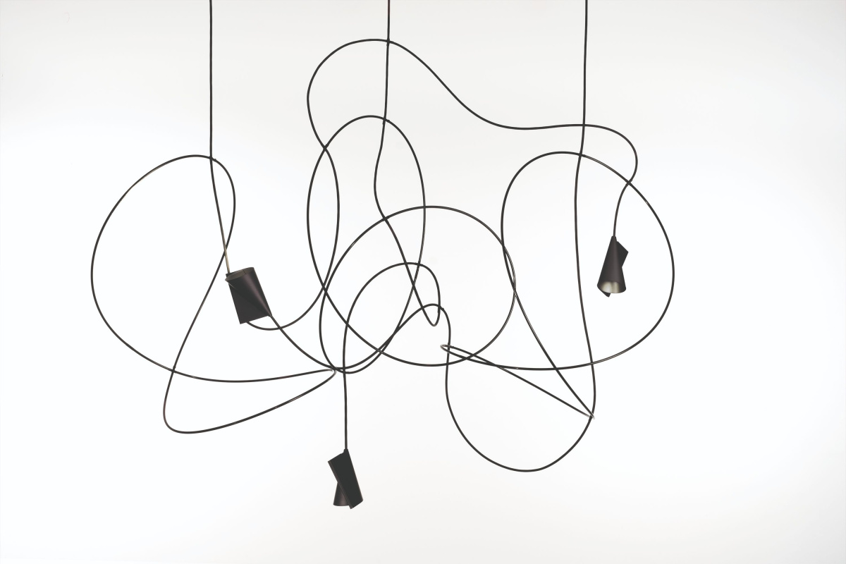 Inspired by the idea of chance–the uncontrolled form created by a falling cable–the Signature lamp by Ingo Maurer appears like a three-dimensional drawing in a room. Photo courtesy of Ingo Maurer