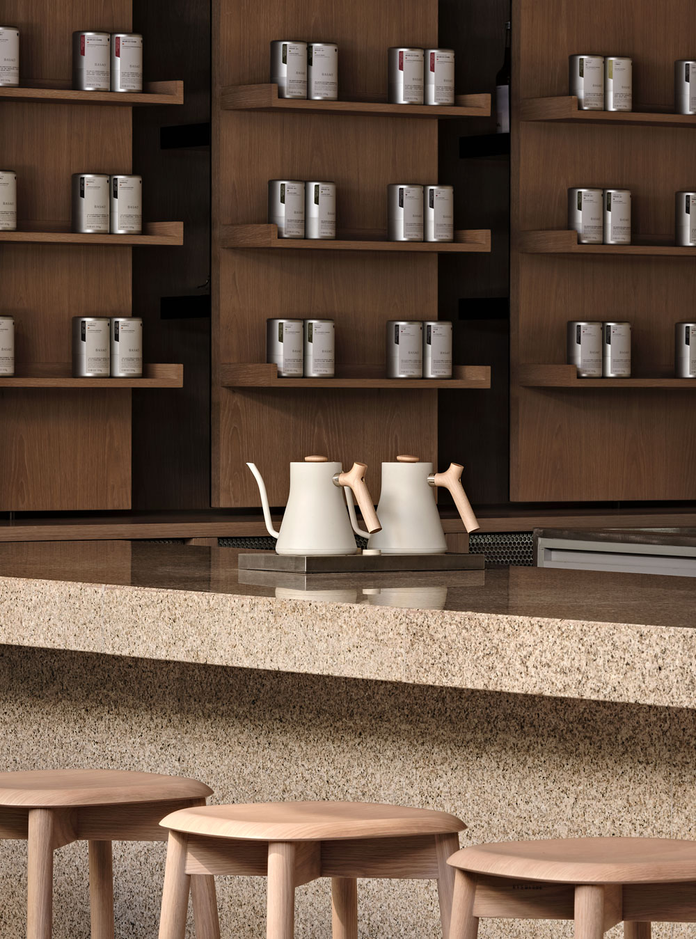 “The experience at the tea counter enables all senses; the touch of the countertop, the heat of the cup, the sound when the ceramic vessel meets the surface, the smell of the tea being poured, the many flavors and the warming, relaxing feel after drinking it,” says Peter Eland of Norm Architects.