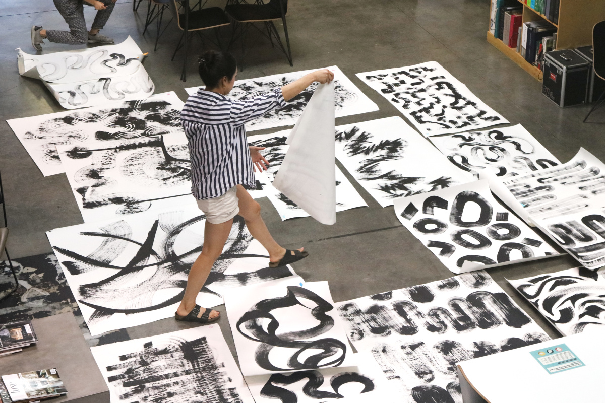 To create this collection, Astek’s designers started by answering a prompt to develop large-scale brushstroke paintings for repeating wallpaper patterns or murals. The team was given limited, controlled materials for continuity across the collection: large rolls of white paper, black gesso, and large brushes. They were encouraged to work on a large scale, creating gestural movements across the page using the entire arm rather than just the hand or wrist. Listening to calming music or taking deep breaths before beginning was also recommended to create the most present, calm, and centered work possible.
