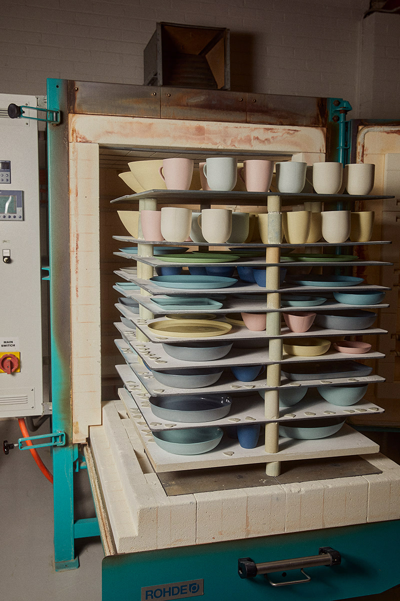 Mud’s best-selling silhouette, the Pebble Bowl, also made an appearance. The bowl first emerged during an experiment with a lighting piece, according to the company. Founder Shelley Simpson was prototyping a light for a well-known department store when the pebble shaped lamp base broke in two during firing, leaving a nicely dimensioned flat-bottomed bowl—and thus the Pebble was born.