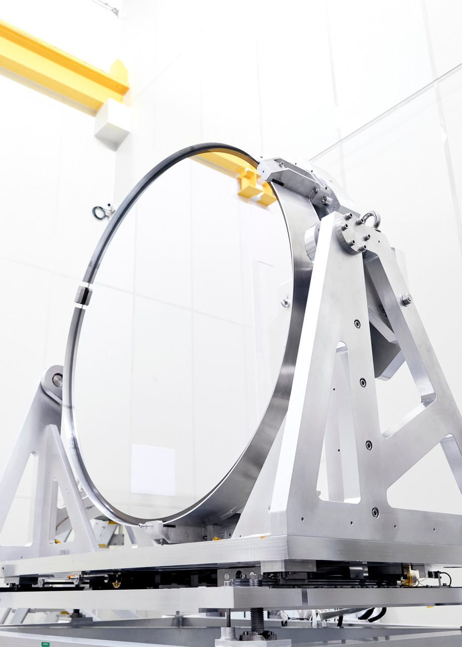 A pigeon interrupts. “That’s Duncan, my agent,” Benedict laughs, before turning back to the conversation. He explains how the European Space Agency agreed to let the duo proceed with the shoot, even if they were a bit suspicious at the time. This changed once the organization knew more about what they were planning: a scientific documentation of a telescope that, once launched next year, will be able to scan the universe “up and down” for dark matter and energy, “the bits you can’t see in space that force everything to be where they are.”