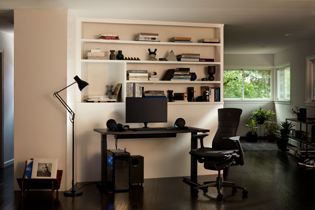 The Herman Miller X Logitech G Gaming Chair shown here with the Ollin monitor arm and Motia gaming desk. Photo courtesy of Herman Miller