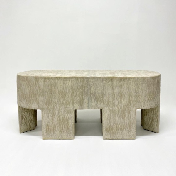 Hun Chung Lee, a Korean artist, presents a magnificent and unique coffee table crafted from glazed ceramic. With a background in ceramic sculpture and a second MFA in sculpture, Lee’s work showcases meticulous control of glaze patterns and transforms solid ceramics into soft, cloud-like pieces. He has exhibited extensively in Korea and the United States.