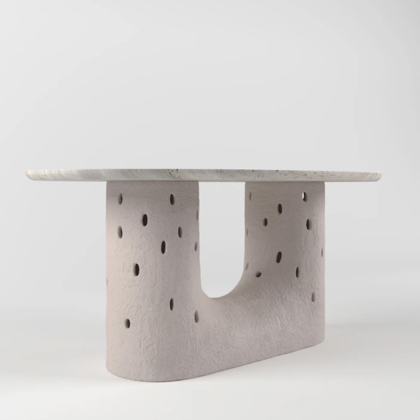 Ukrainian designer Victoria Yakusha founded FAINA, a collection released twice yearly on the summer and winter solstices, with the philosophy of live design at its heart, encouraging physical interaction with each piece. ZTISTA means “made of dough” in Ukrainian—and it’s clear why the material that makes the leg of the oval table is named such. A sustainable blend of clay, hay, and other recycled materials, ZTISTA is designed to return to nature. The oval table features a living ash-wood top and FAINA’s signature holes in a piece that amplifies the energy of its material, giving it a spontaneous, lively feel. Made with a technique similar to the Ukrainian craft of valkuvannya, once used for wall finish, each piece is different from the next. €16.800,00