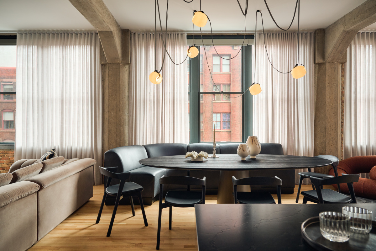 The dining area is illuminated by the sculptural Vitis 5 chandelier by RBW, suspended above the Materic Ovale table by Porro. A Kirkwood leather banquette from West Elm adds comfort, paired with Bok dining chairs by Ethnicraft for a blend of texture and form. Seeing Ghosts ceiling paint by Tonester.