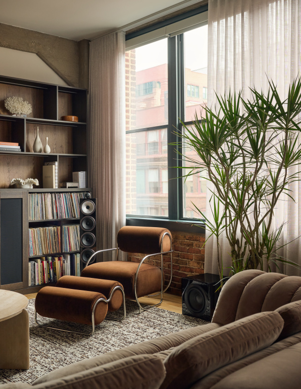 “I absolutely love it,” he says. “It’s actually two credenzas placed side-by-side. They add great texture and provide tons of storage.” The Marantz Grand Horizon wireless speaker sits on top of the credenza. With solid wood construction, heavy brass detailing, and a beautiful finish, Chris says it resembles an art piece more than audio equipment—though it delivers exceptional sound quality with lossless audio streaming.