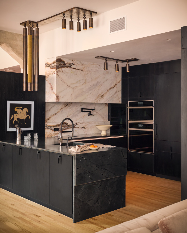 Lighting comes from Brooklyn-based brand Apparatus. “PROjECT had the idea to have them custom-wrap one of the tubes in leather, which they kindly did,” Chris says. “It adds a nice personal touch.” Stone from Calia covers the backsplash and counters. Chris says the team kept a lot of the natural striations and imperfections to emphasize the natural materiality, and added details like the double-hung ledge that gives the illusion of folded layers.