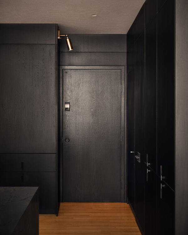 The kitchen seamlessly transitions into the entryway where sleek, all-black cabinetry by nobilia is designed to recede into the walls and minimize visual clutter.