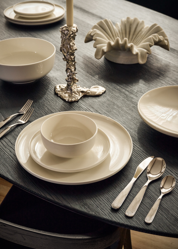 A ceramic dining set by Villeroy & Boch anchors the table—special and thoughtfully designed, yet appropriate for everyday use. The ceramic’s subtle striations pair perfectly with the flatware’s fluting.