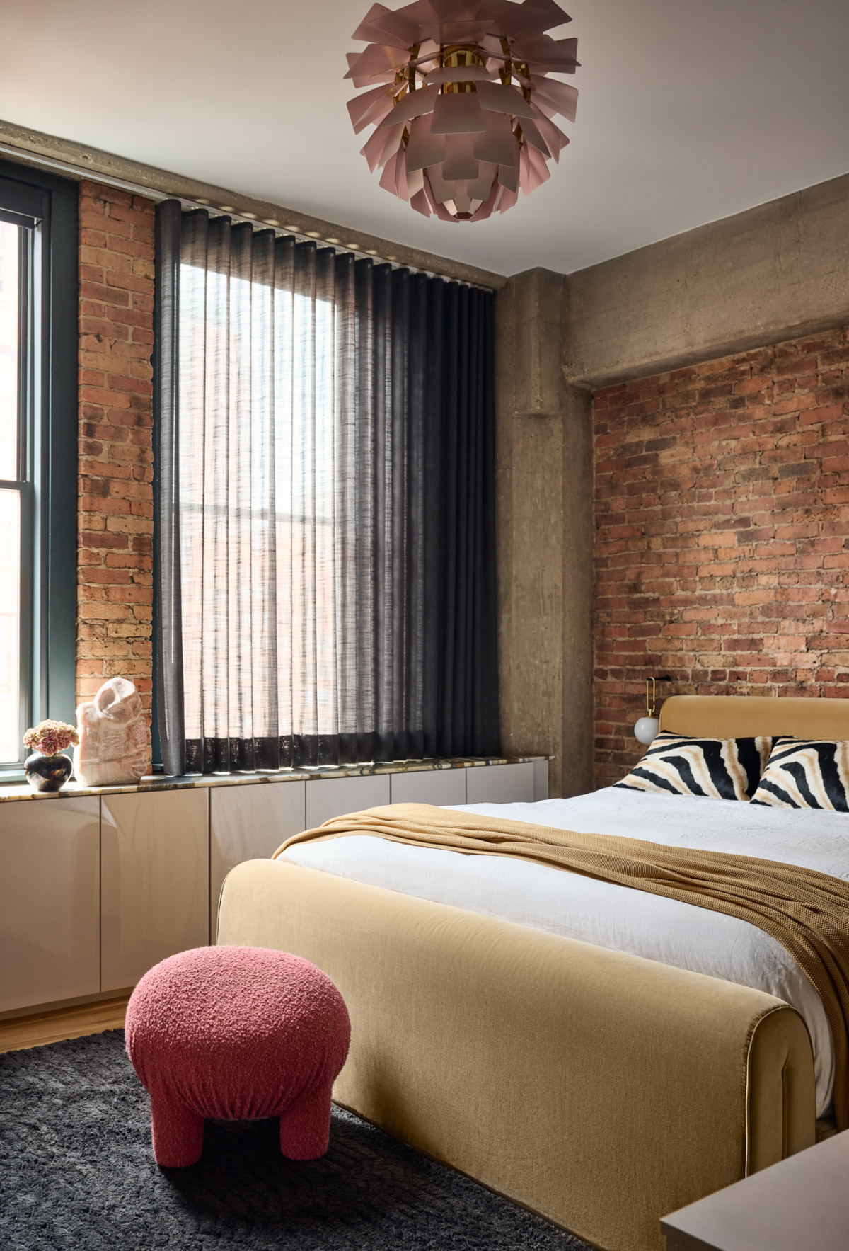 - The bedroom is built around the Artichoke Anniversary Edition pendant by Louis Poulsen. It’s complemented by the Sigrun bed from West Elm, Zebra pillows by Jayson Home. mattress by Saatva, Moroso Anomaly pouf, and Savannah rug by Armadillo. Fabbricotti Calacatta stone from Calia.