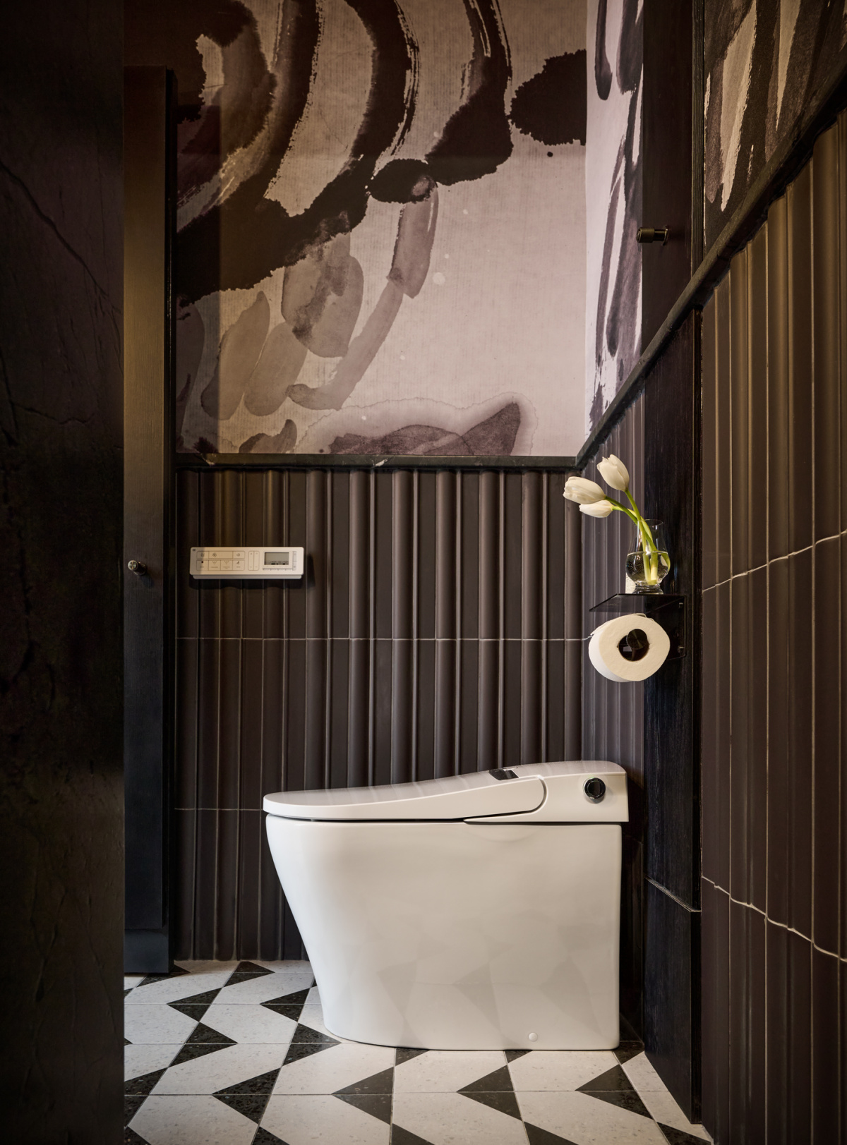 A concealed bathroom off the kitchen provided an opportunity for bold design choices. “We wanted it to feel like a secret room, and to do something fun and interesting here for when you do finally discover it,” he says.