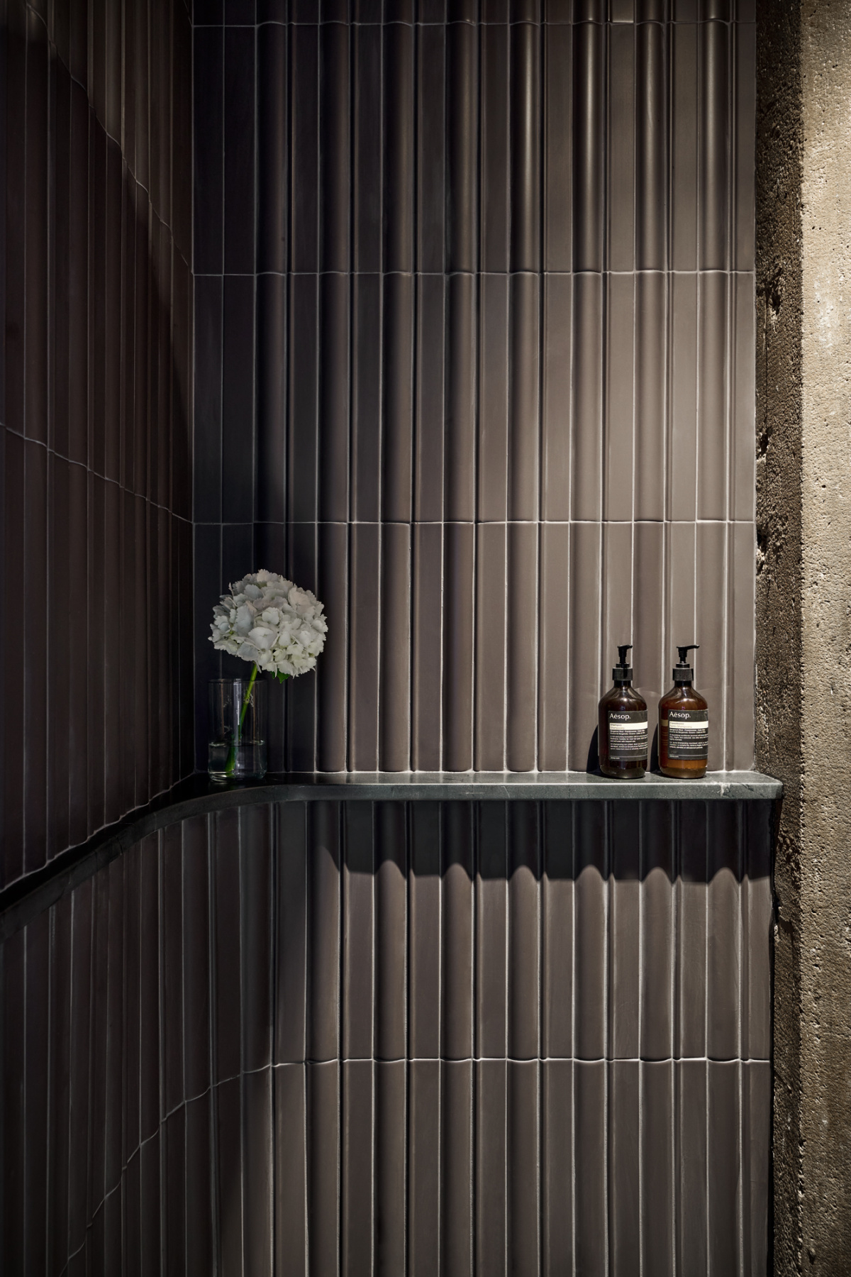 - Black Diamond stone by Calia anchors the wall tile, paired with the Manhattan freestanding console sink from Concretti Designs and a Grohe Atrio two-handle faucet. Roc sconces by Marset. Black Orange ceiling paint by Tonester. Soap by Loewe.