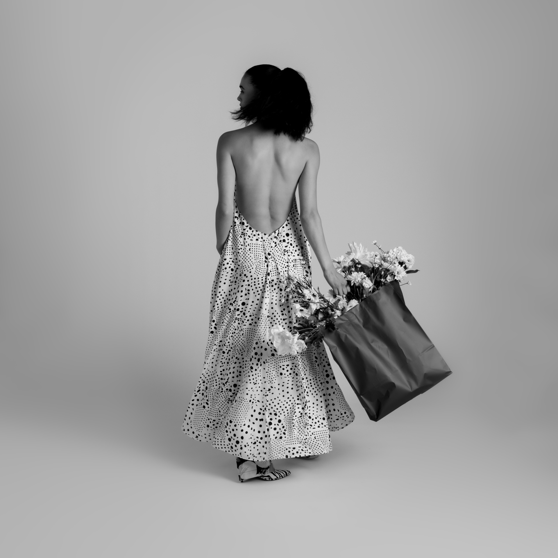 The wild patterns and bold cuts of his work are sometimes described as cheerful, but looking through his collections I see something more aggressive—a reaction to tense times, an assertive demand to exist for an audience of one. “I feel like we’re in a hard time, but I’m trying to be positive. There is an aggressive optimism to what we’re doing. Our clothes are real. You can wear them.” Christopher points to a nearby dress hanging from a clothing rack that to me looks something like a mix between a sock hop-era poodle skirt and the tutu on Degas’ ballerinas. “This dress is inspired by a 1950s dress we turned inside out. It doesn’t touch the floor; you can still wear this. It’s mostly out of cotton. I have a friend who would wear this with sneakers and go to Trader Joe’s. Giving people that tool is quite glamorous, but putting all the pieces together in a way that’s pragmatic is what’s interesting to me. I like for clothes to teeter between incredibly high octane and quite easy. Depending on how you feel, you can take the garment and make it what you want.”