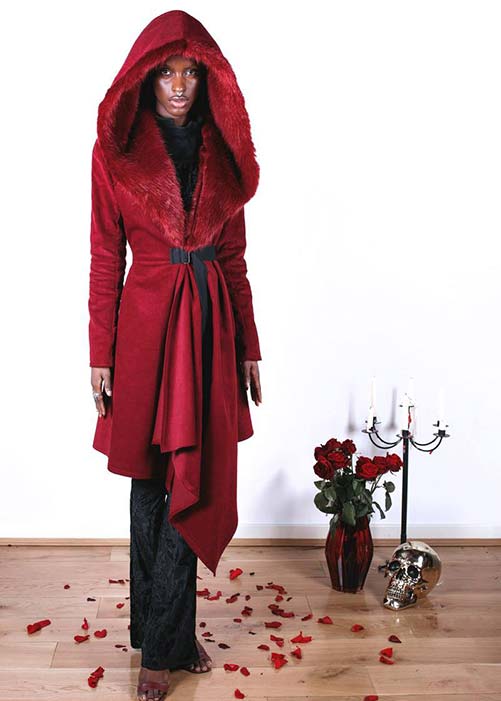 The good stewardship is all in service to exquisite style. Lucinda culls inspiration from symbolism, divine rituals and icons, and historical and mythical female figures to craft dramatic flowing trains, impeccably detailed coats, and striking silhouettes—all tailored with a degree of sophistication that transcends subculture. We chatted with Lucinda about striking the balance between wearability and high drama, what happens when someone rips off your design, and diversifying the world of gothic fashion.