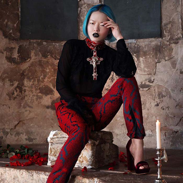 Yen wears Renaissance Trousers and the Priestess Top from Lucinda’s Forgotten Apostles collection. COURTESY OF CHURCH OF SANCTUS.