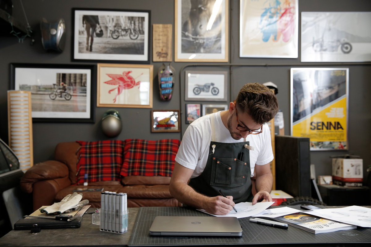 Dave’s design talents go well beyond shining boots and motorcycles with magic. As a student at the College for Creative Studies in Detroit, he learned the foundation of product and transportation design. His shop now serves industry-leading clients like Snap-On, Progressive Suspension, and Bosch. His work often begins in exhaustive research, hundreds of renderings, and meticulously made mockups. I spoke to Dave about design, when craft elevates to art, and the current state of custom motorcycles from his shop in Portland.