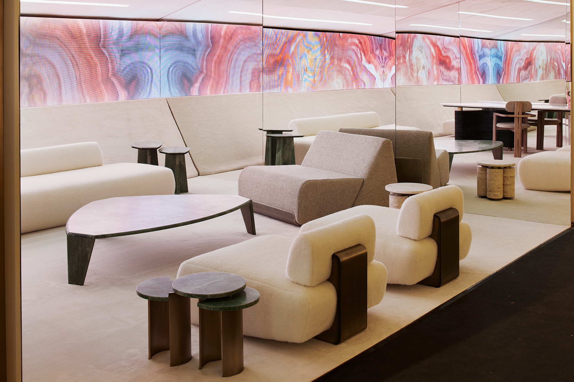 Greeting attendees with oversized, colorful shapes that are as much seating arrangements as they are sculpture, “Tomorrow Land” aspires to be a big interactive playground. In light of all of the festival’s tech integrations, the play doesn’t stop there: Studio Proba’s sculptures enter the virtual world with their own accompanying app from Enjoy the Weather. The commissioned work lives on beyond Design Miami—it will remain in situ until May 2022.
