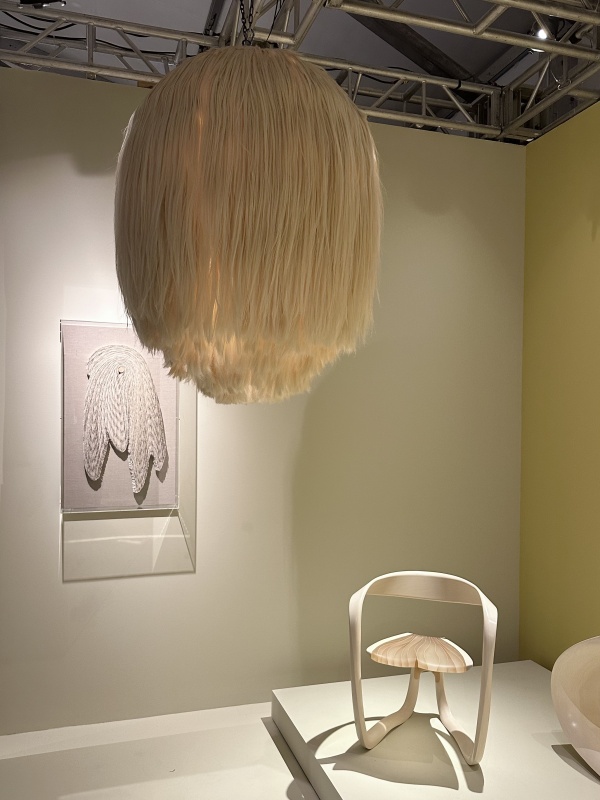 Sarah Myerscough’s booth at Design Miami 2023, “The Nature of Things,” celebrates the transformation of natural materials into covetable collectibles, made all the more desirable by the way the material takes agency in the design process. Angela Damman’s Eta chandelier fit the bill perfectly. Angela partners with local artisans in Yucatán, Mexico to create textiles from native plant fibers—in the chandelier, sansevieria plant fiber takes center stage. The chandelier and Angela’s other works bring form to the material traditions and culture of the Yucatán. The shaggy puffball chandelier glows, alive with the origin story at its heart.