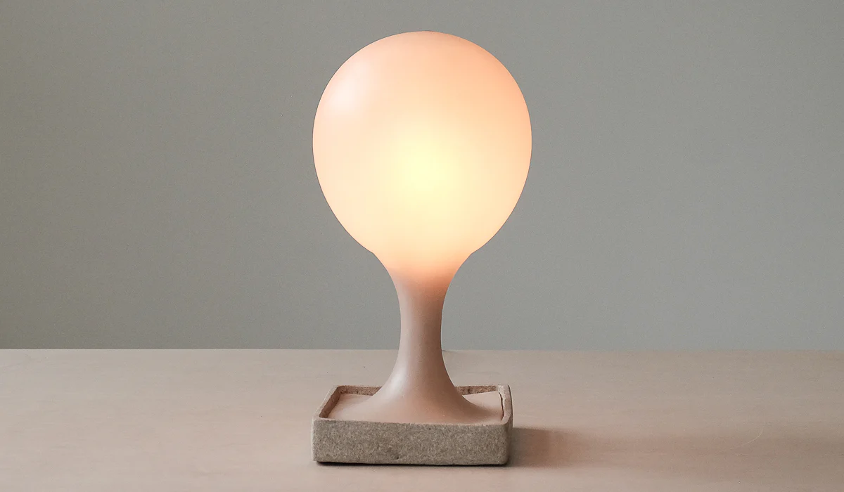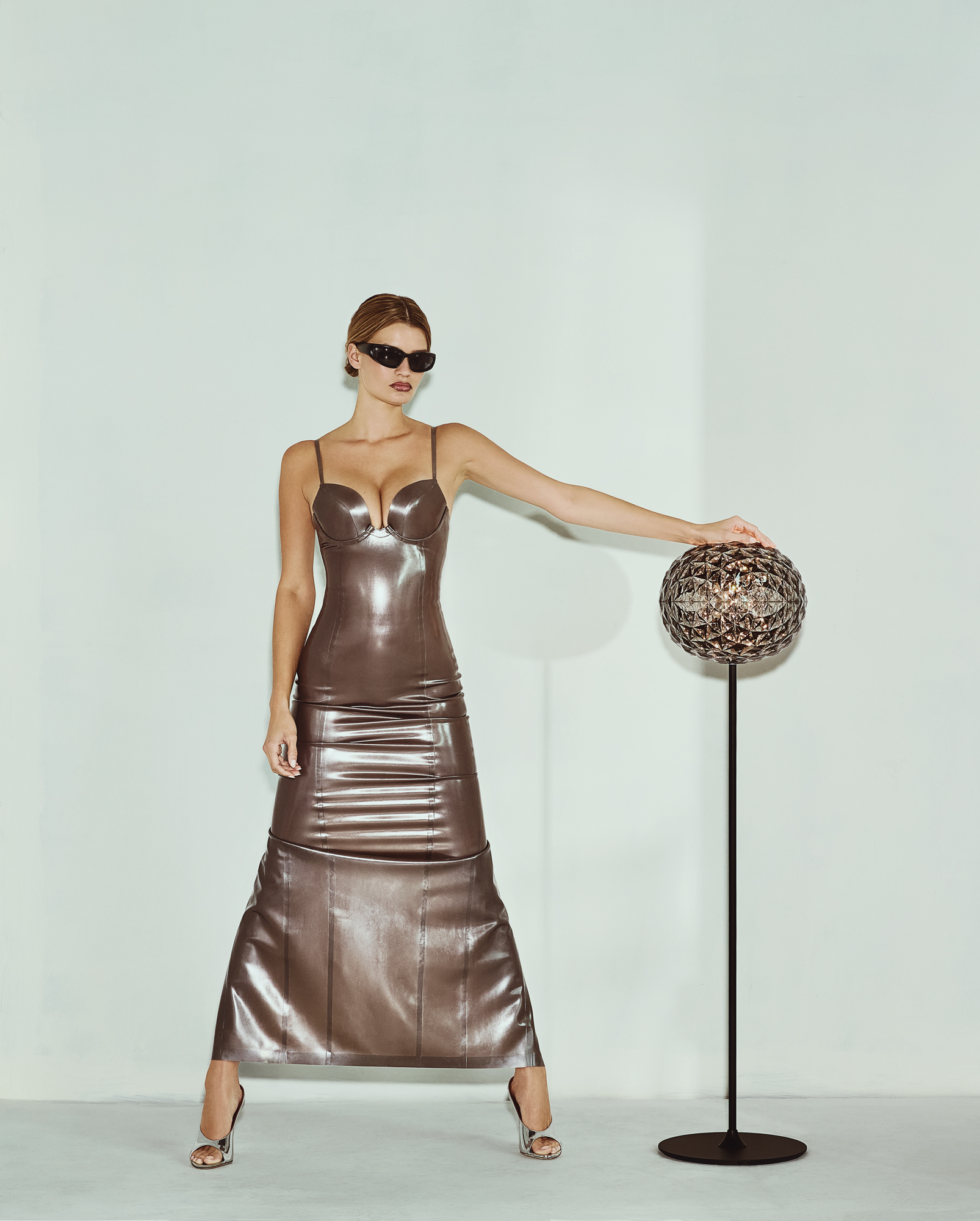 Right, next photo: Miss T column dress by ATSUKO KUDO. Anok 105 Slipper Silver by AMINA MUADDI. Planet floor lamp by Tokujin Yoshioka for KARTELL
