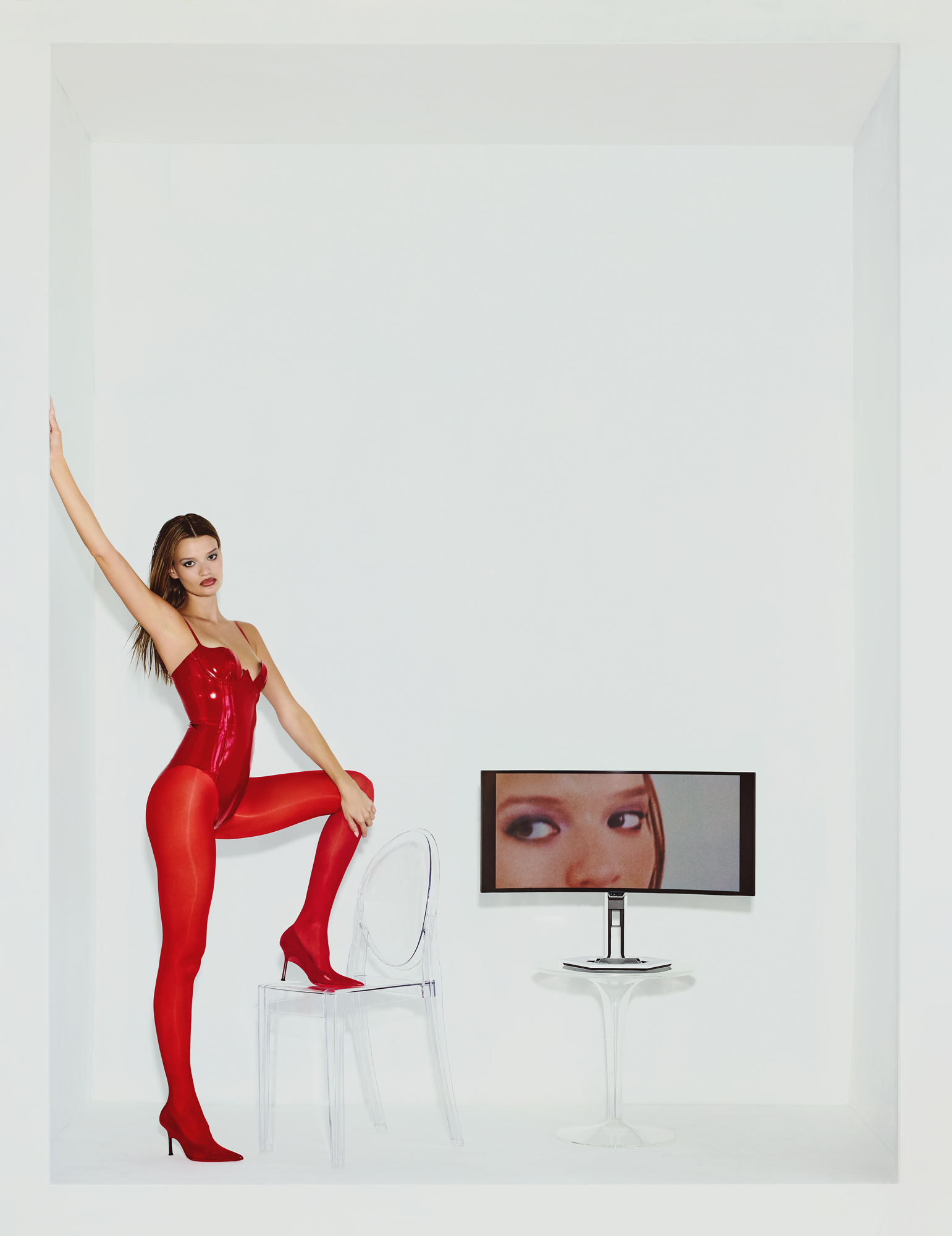 Right and left: Paris Cup bodysuit with high cut leg by ATSUKO KUDO. Heels by JEFFREY CAMPBELL. Victoria Ghost Chair and Tip Top side table by Eugeni Quitllet and Philippe Starck for KARTELL. Monitor by LENOVO