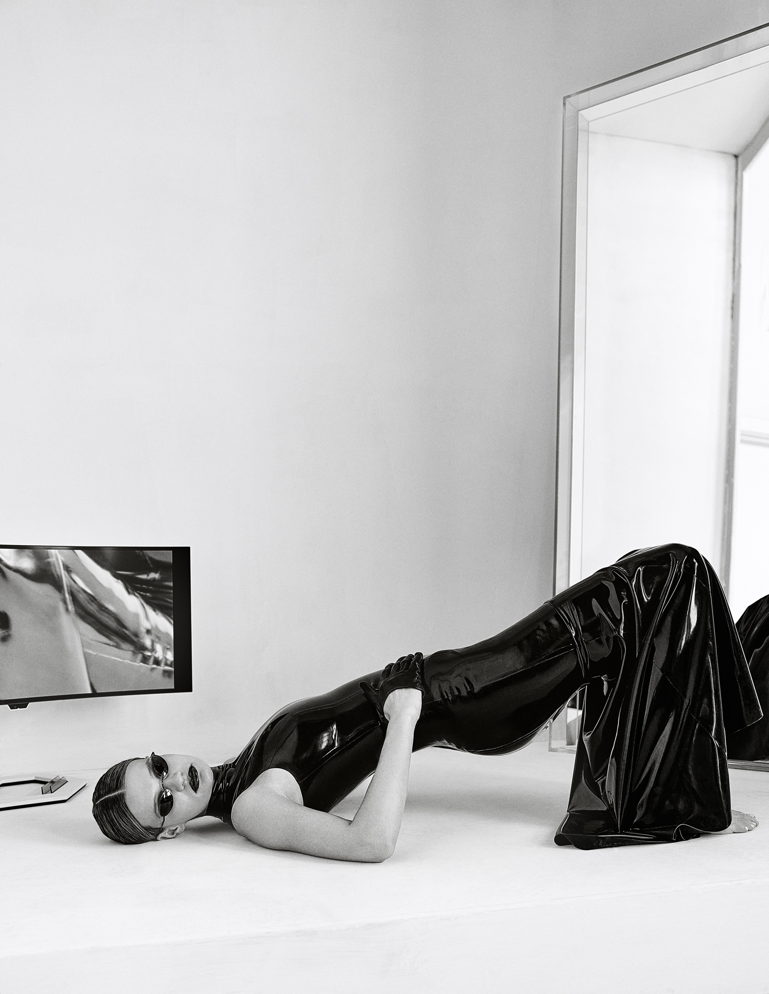 Left and right: Couture latex leggings, gloves, and bra by ATSUKO KUDO. Anok 105 Silver Slipper by AMINA MUADD. Victoria Ghost chairs and Charles Ghost stool by Philippe Starck, Invisible Table by Tokujin Yoshioka, and Aledin Tec Desk Lamp by Alberto and Francesco Meda for KARTELL. Drinking Glass by Erik Höglund for HEM. Eyewear by DISTRICT VISION